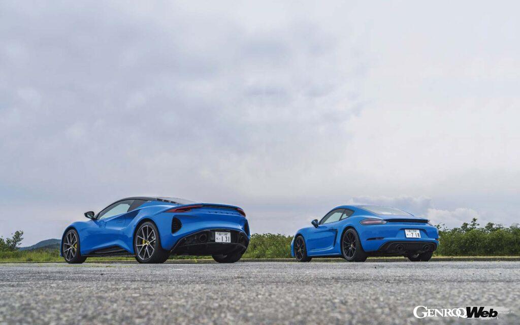 朝の箱根にやってきた青いロータス・エミーラV6ファーストエディション。そのボディはいくぶん厚みがあるが、シャープな造形はエリーゼの兄貴分もしくは延長線上にあることがひと目でわかるものだった。今回エミーラのポテンシャルを推し量るチェイサーとして用意した1台はポルシェ718ケイマンGTS4.0。偶然にもよく似たブルーのカラーリングに包まれた2台のミッドシップ2シーターのスポーツカーが顔を揃えることになったのである。