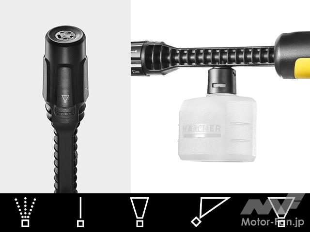 ペットボトルやバケツなどから吸水ができ、ホースやアダプターも標準装備。5in1タイプのノズルは5種類の洗浄モードを切り替えられ、使用場所や用途に合わせて使い分けられる。洗浄剤タンクを利用すれば泡洗車にも対応する。