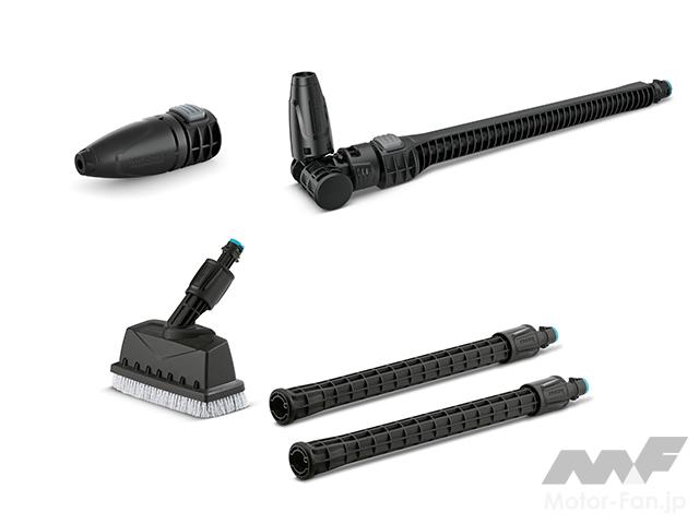 別売アクセサリーとして、高圧の水を回転させながら噴射する“サイクロンジェットノズル”、ノズルの向きを360°自由に変えられる“フレキシブル可変ノズル360°”、水はねを防ぎながら洗浄できる“テラスクリーナー”などをラインアップ。