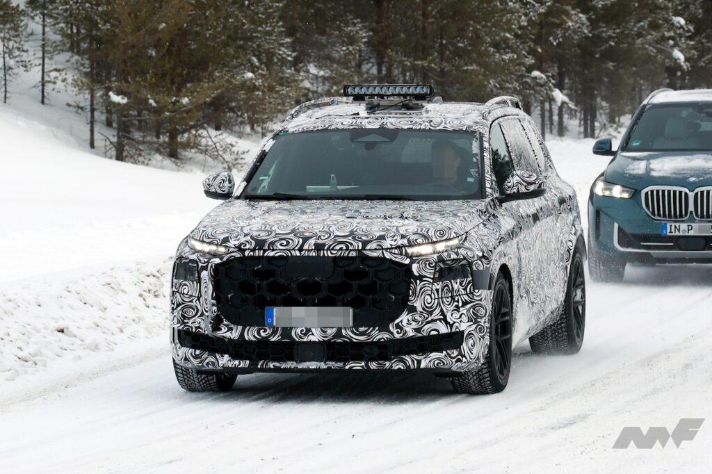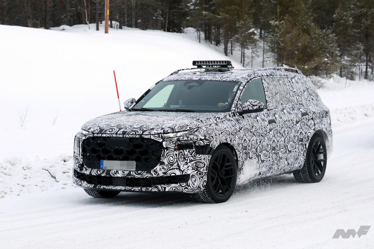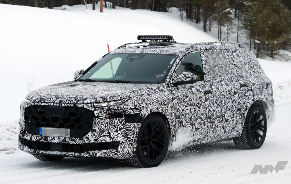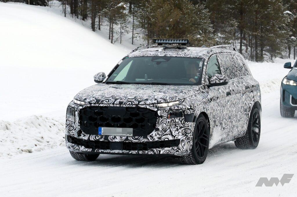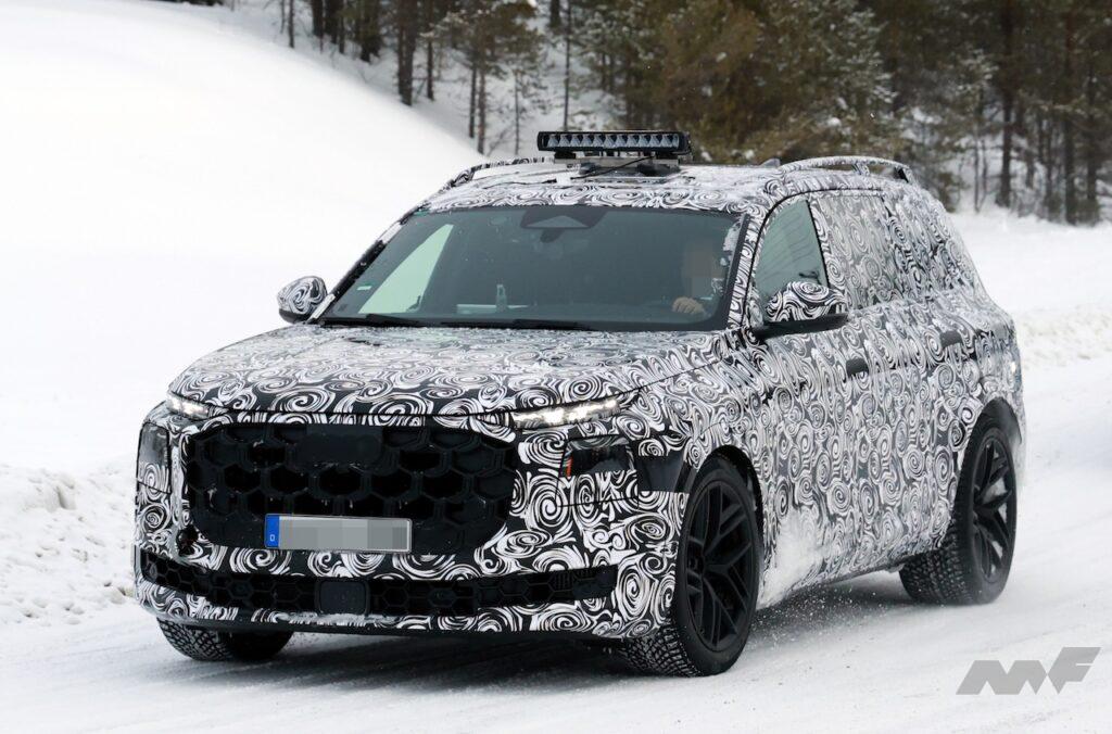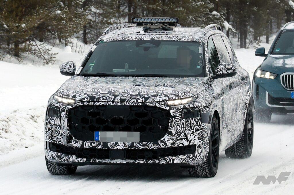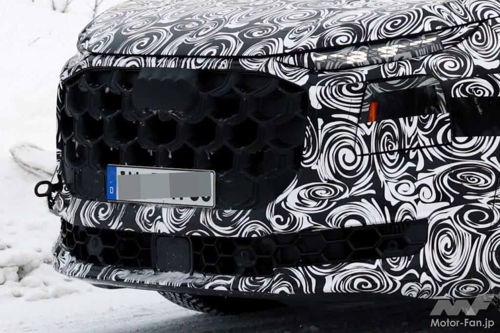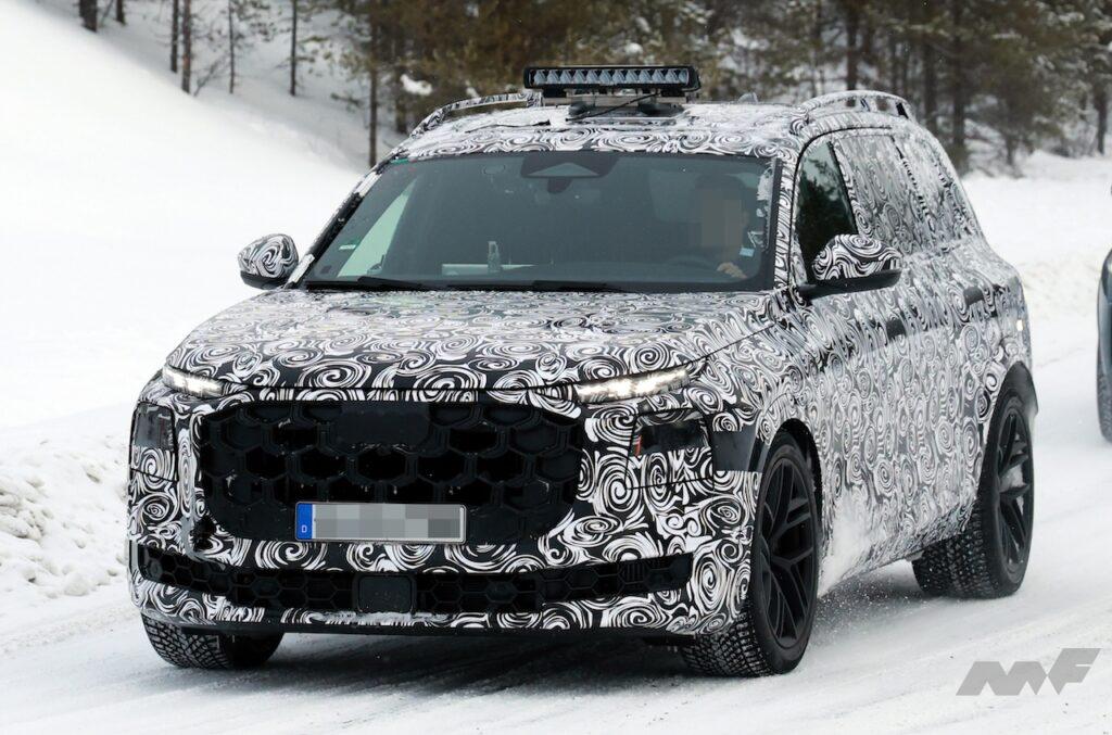 捉えたプロトタイプのフロントエンドには、Q7よりさらにスリムなヘッドライトを装備、グリルは巨大で、非常に高いボンネットラインまで伸びていることがわかる。