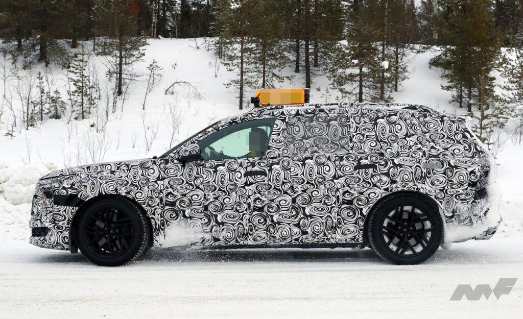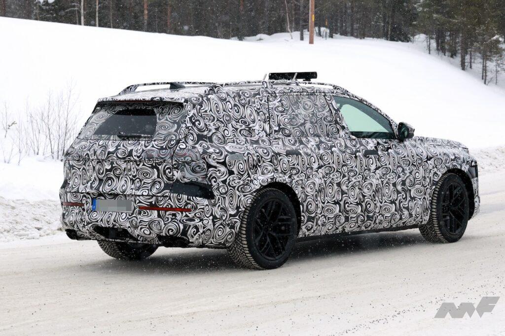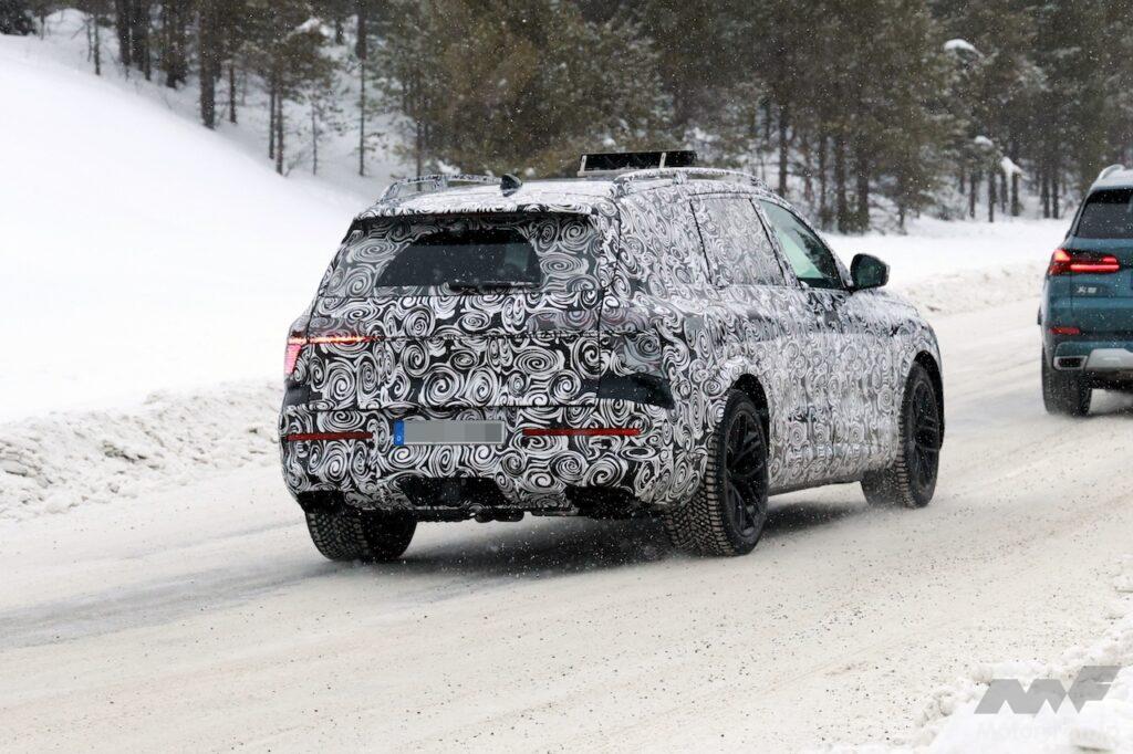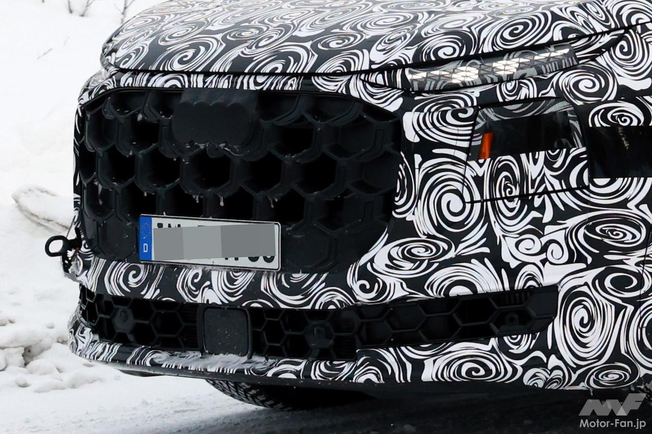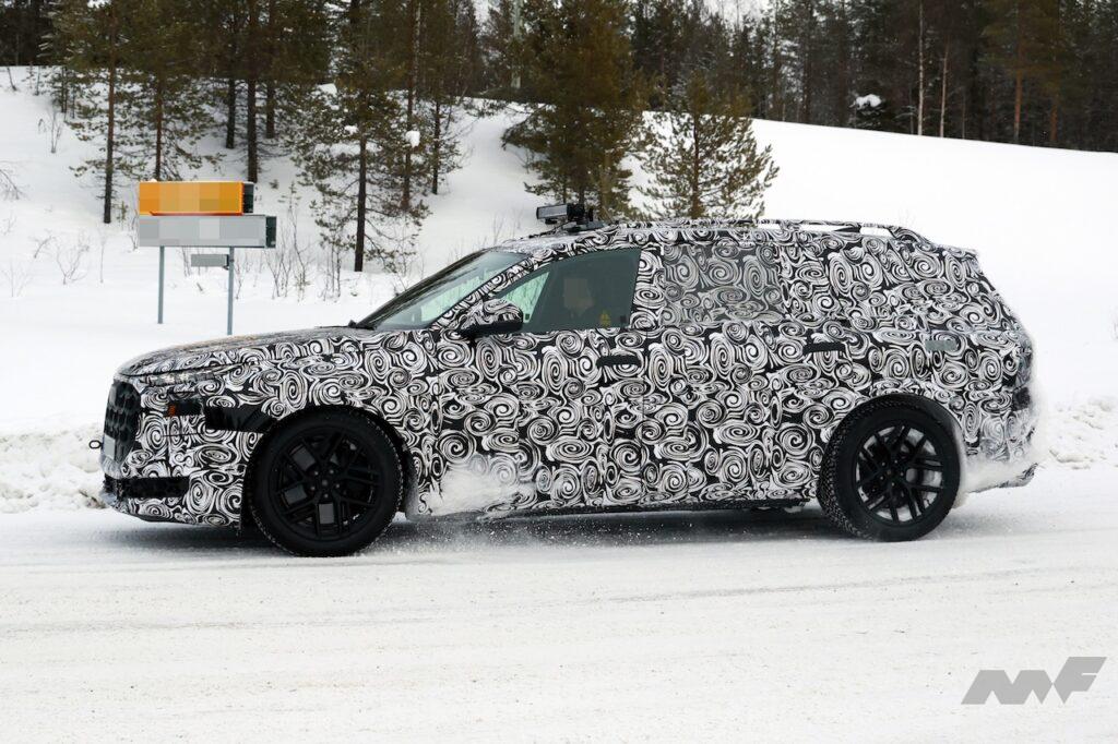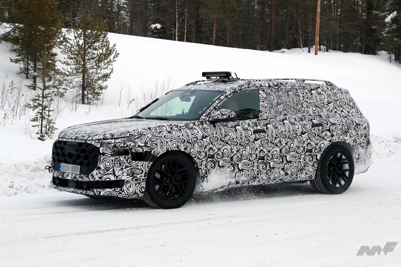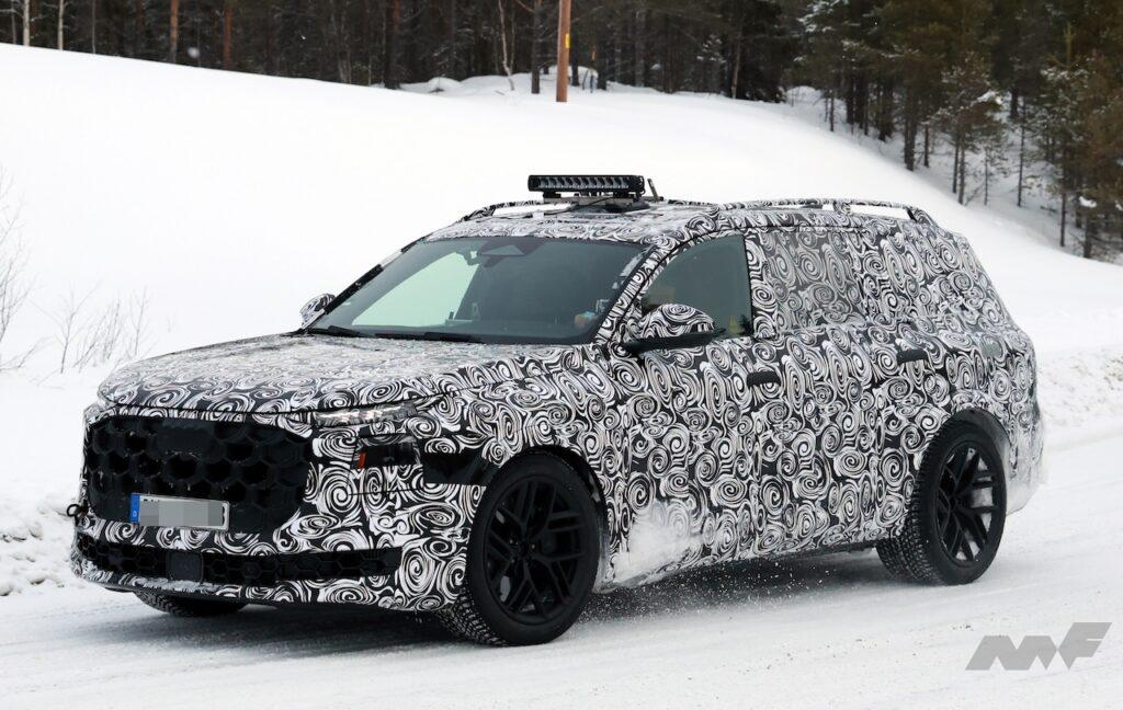 捉えたプロトタイプのフロントエンドには、Q7よりさらにスリムなヘッドライトを装備、グリルは巨大で、非常に高いボンネットラインまで伸びていることがわかる。