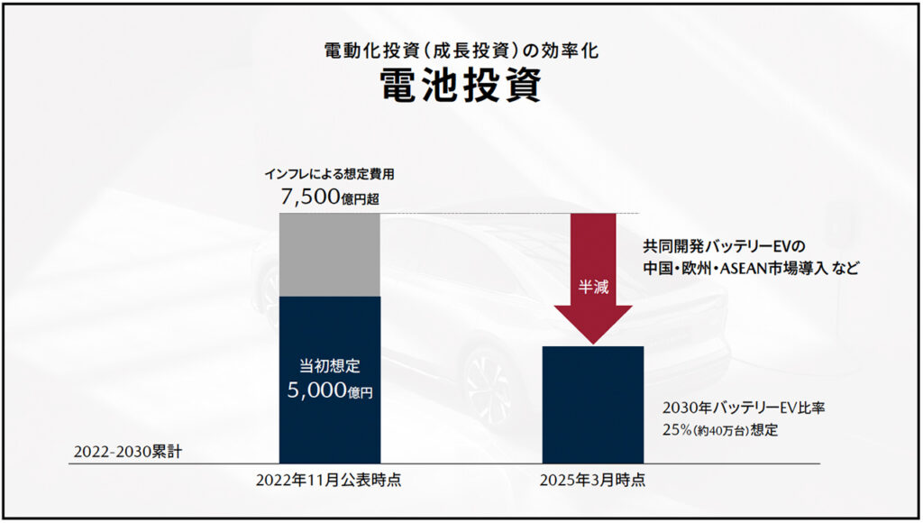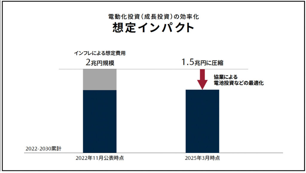 ・電動化投資の最適化:2022年に発表した2030年までの電動化投資1.5兆円は、インフレ影響で2兆円規模となる見込みだったが、電池投資の最適化により、総額1.5兆円程度に抑制。電池投資に関しては、全量自前調達の想定だったが、協業を活用することで7500億円規模から半減。