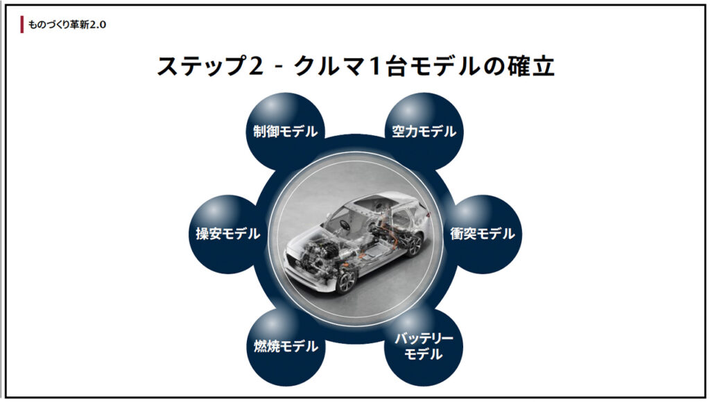 2015年から取り組んでいる、マツダ独自の開発・生産プロセスの進化形「マツダ ものづくり革新2.0」をさらに推し進めていく。バッテリーEVからエンジン車までの開発・生産を一括企画するほか、ユニット単位だったモデルベース開発(MBD)を、AI活用により車両全体のモデル化へ拡張し、さらにJAMBEなどとの共創により、サプライチェーン全体にも適用する。また、生産プロセスにおいても混流生産ラインにAGV(無人搬送車)を導入し、需要変動に対する柔軟性を確保する。