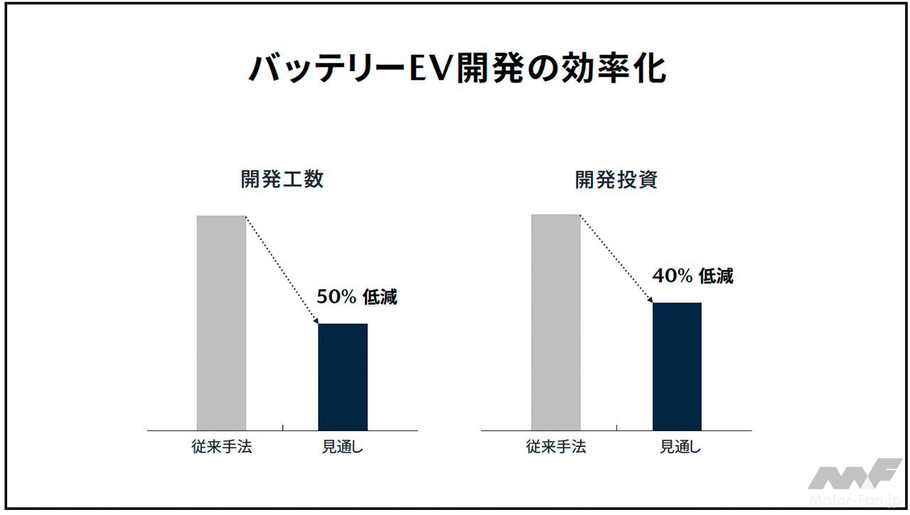 ・バッテリーEVの開発と生産最適化:2027年導入予定のバッテリーEVについて、協業を活用することで開発投資を40%、開発工数を50%削減。また、既存生産ラインを活用することで、専用工場を新設する場合と比較して初期設備投資を85%、量産準備期間を80%削減。