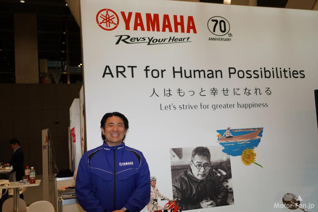 ヤマハ発動機CSOの青田元氏は、この展示について「そもそもヤマハ発動機の社員に対しての展示である」としたうえで、大企業のいいところは「歴史だ」と述べる。ヤマハ発動機という既に大企業となった会社の社員は、その企業が築いてきた歴史を振り返り、いま自分たちがどこに立っているかを確認してほしい。そのうえで、これから目指すべきものを3つの言葉でまとめたと言う。それが、「モビリティの楽しさ」「豊かな人生」「地球との共生」だという。この中には、ヤマハ発動機は元々モビリティの会社なのでモビリティで楽しみたい。それによって人の人生を豊かにしたい。そして結果として地球との共生もしたい、というメッセージが短い言葉に込められているわけだ。まず第一に「地球環境ありき」などと押し付けないんだ、と言い換えればわかりやすいかもしれない。