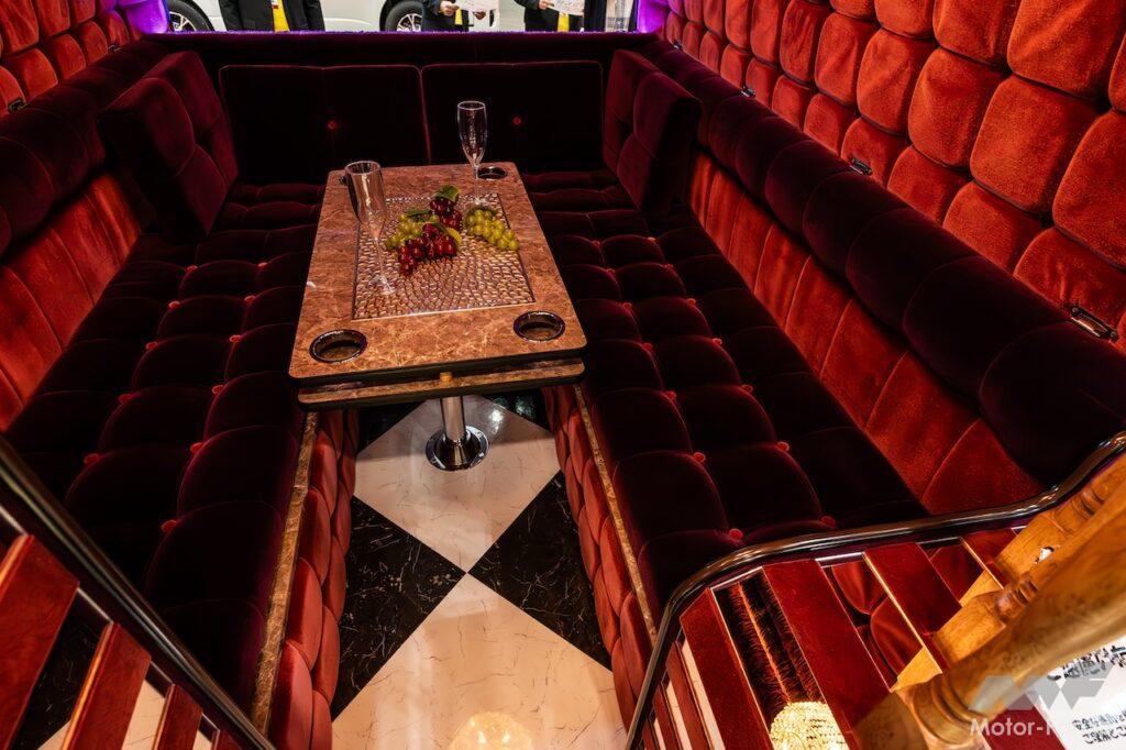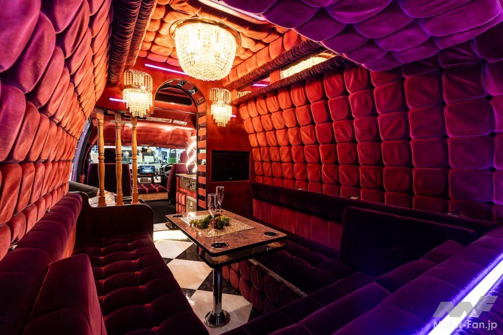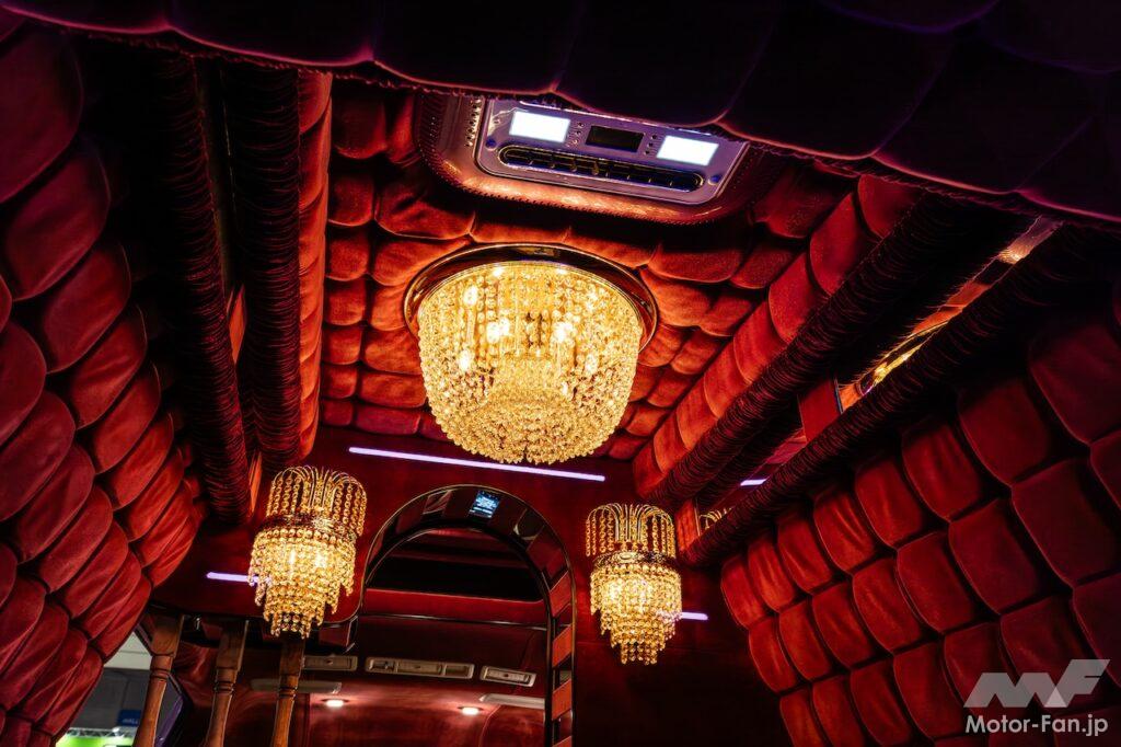 だが、この技術を持った職人がどんどん減っているということで、今回同社が令和の世の中に復活させたというわけだ。車内にはデコトラ用のシャンデリアや中古の装飾木材が惜しみなく使われており、もう昭和のカラオケバーそのもの。