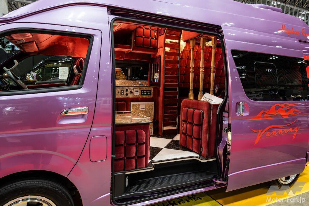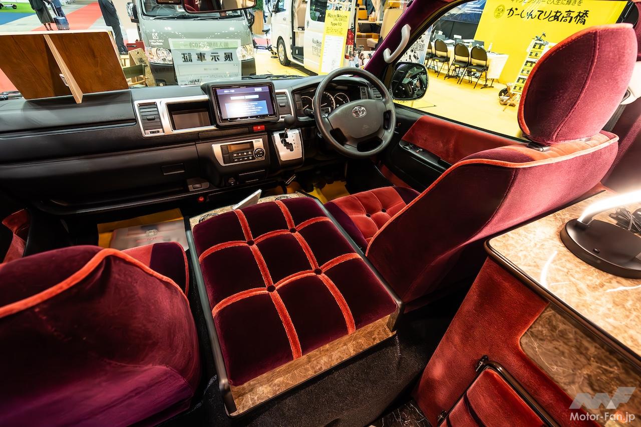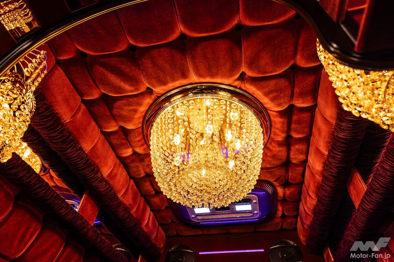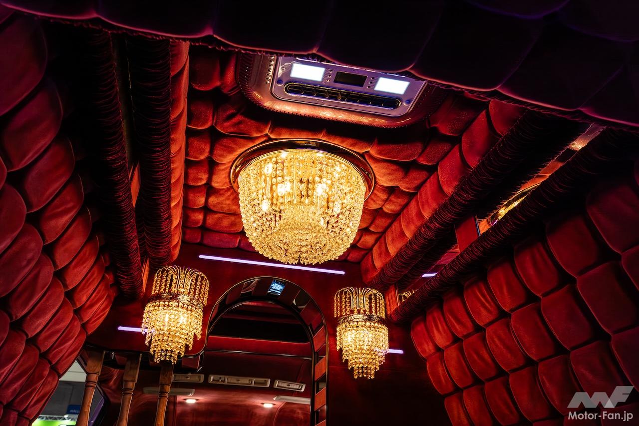 価格は1000万円を越える高額車だが、その技術の素晴らしさを考えれば納得できる。なにせ運転席、助手席までふとん張りで、車内を3つのシャンデリアが妖しく照らしてくれる。昨今のキャンピングカーは、なかなか個性を演出するのが難しくなっているが、同モデルはまさに“天上天下唯我独尊”。もちろん道交法上で合法なクルマなのでご安心を。