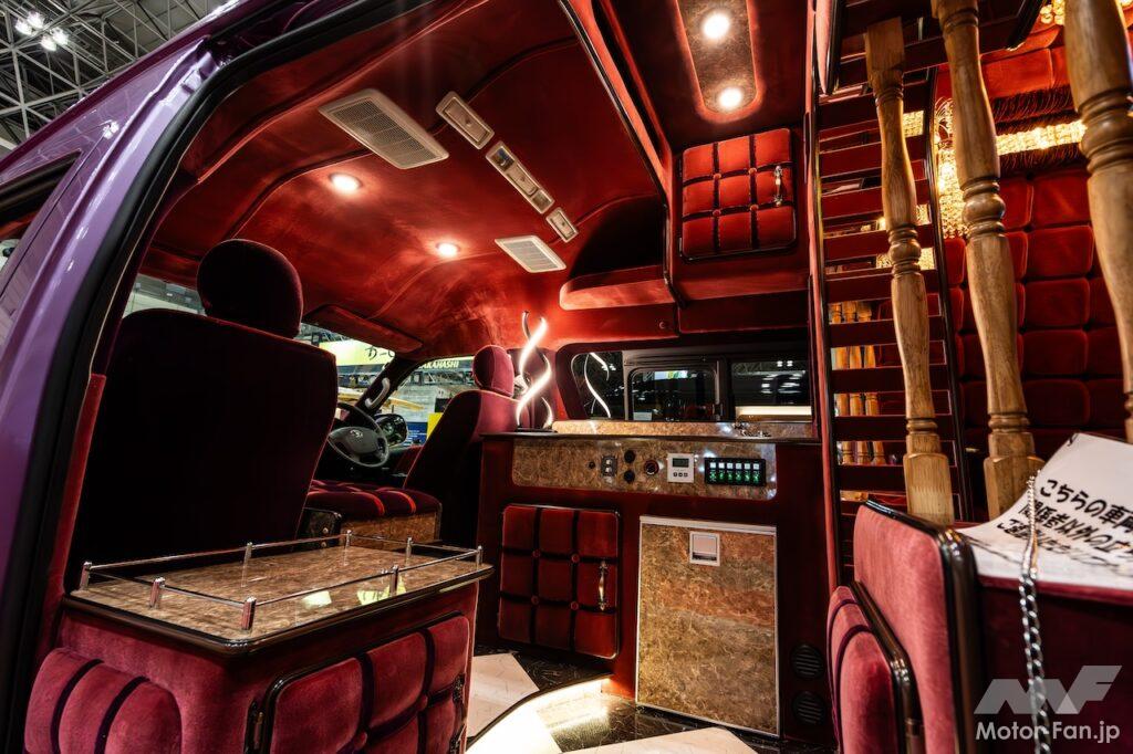 昭和の「カラオケバー」の雰囲気を再現したという車内インテリアのメインとなっているのが、“ふとん張り”というトリム。インテリアに立体感が出せるだけでなく防音効果も望めるため、かつては映画館や飲食店などに多く使われていた。そんなふとん張りをしたバーラウンジのイメージを車内で再現したインテリアは、デコトラやバニングカーでもずいぶん流行った。