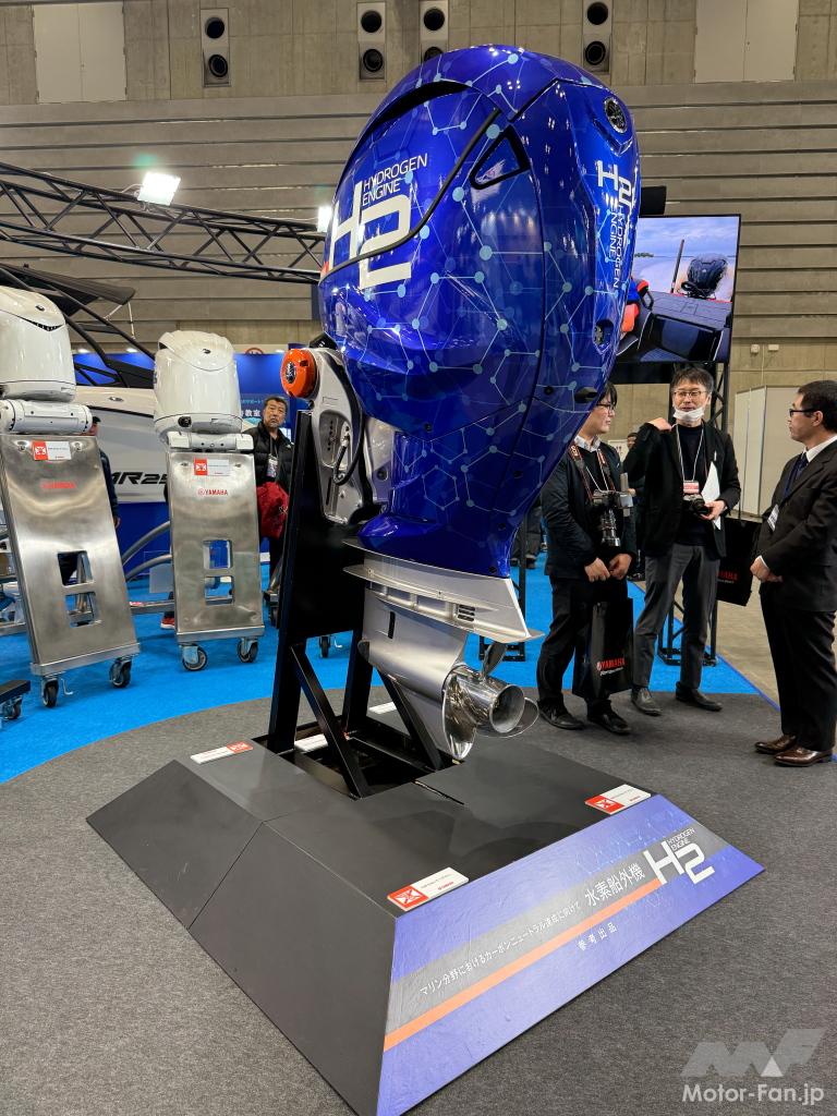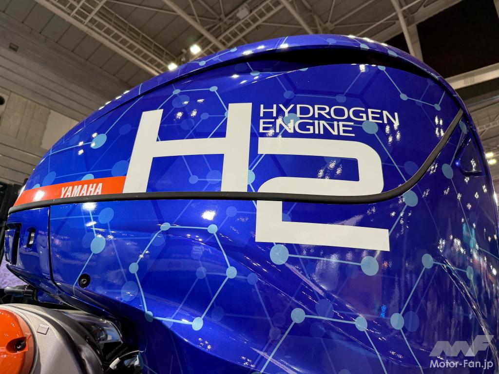 ヤマハ発動機ブースでもうひとつの注目したい展示が水素エンジンの船外機。ベースとなるガソリンV8エンジン舶用であり、トヨタ向けの自動車用エンジンがベースではなく、自社船外機用エンジンがベースとのこと。主にガソリン用のインジェクターなどを水素用として、シリンダーにダイレクト噴射する。水素タンクはトヨタミライなどに使用されているものより大型のもので、アメリカのラウシュ社のものをこれまで使用している。