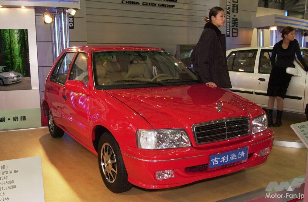2001年の上海車展(上海モーターショー)に吉利が出品した豪情。天津夏利製「シャレード」のコピーで、エンジンはトヨタにライセンス料を支払って5A系を搭載していた。この取材の日に初めて会った吉利の李書福董事長は「自動車を作る」ことに対する情熱がものすごく高かった。