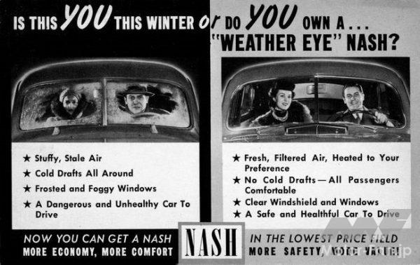 こうしたメイソンの開明的な経営方針もあって、ケルビネーター社とのコラボはナッシュの作るクルマにすぐに良い影響を与えた。1938年にケルビネーター社が持つ技術を応用し、「コンディションド・エア・システム」と呼ばれる取り入れた外気をエンジン冷却水の廃熱を利用して任意の温度に調整するヒーターシステムの開発に成功したのだ。1939年にはこのシステムにサーモスタットを追加することで「ナッシュ・ウェザー・アイ」と称する近代的な自動車用ヒーターへと発展させたのだ。これは現代の自動車に採用されているヒーターシステムと基本原理は同じである。