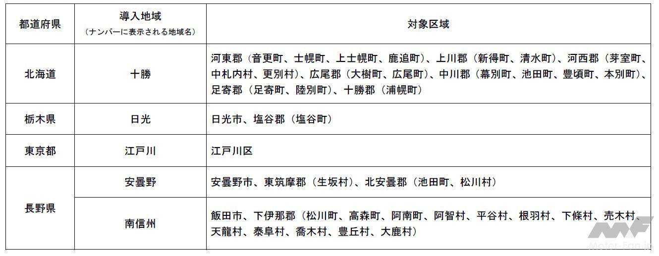 そして新たに追加される(事前申し込み4月頃/交付5月頃)のが北海道運輸局管内の『十勝』、関東運輸局管内の『日光』、『江戸川』、北陸信越運輸局管内の『安曇野』、『南信州』となる。
