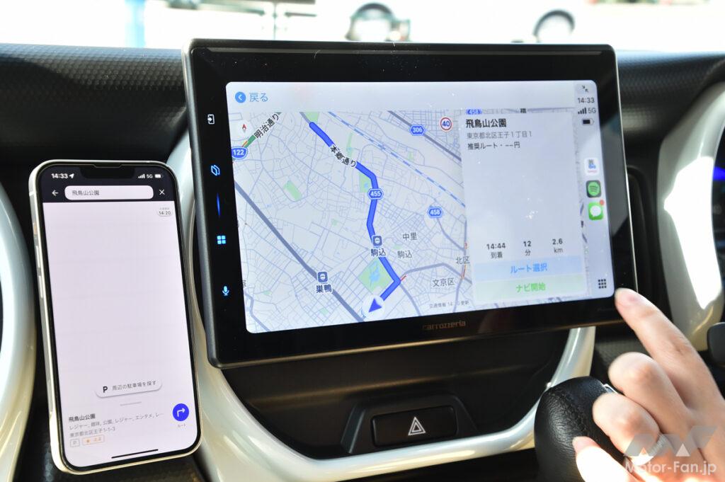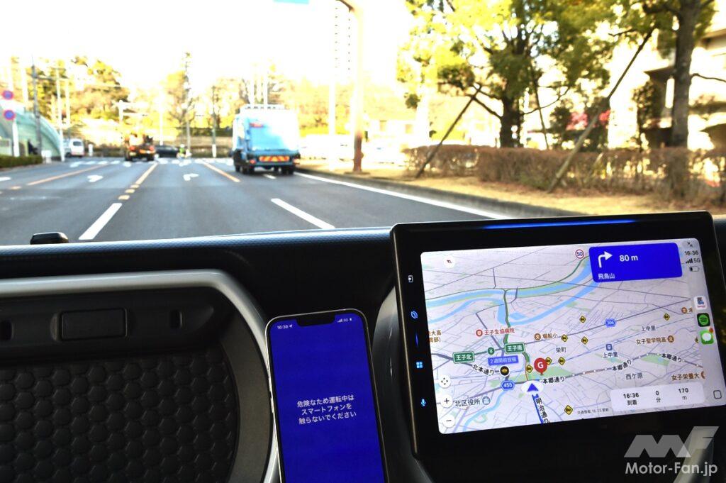 また、接続しているスマホの画面には距離、到着時間、所要時間、案内終了アイコンが表示されるが、画面の大部分を運転中には操作しない旨の注意喚起が表示され操作できないようになっている。ただ、経路表示は可能で、表示内容としてはカーナビタイムと同等だ。