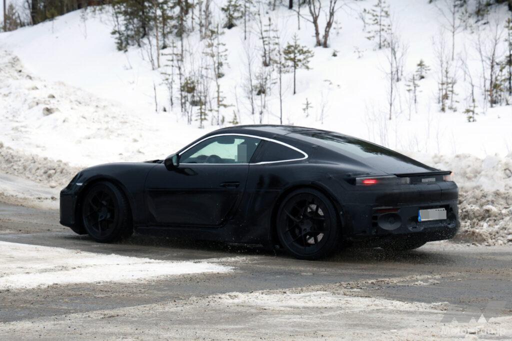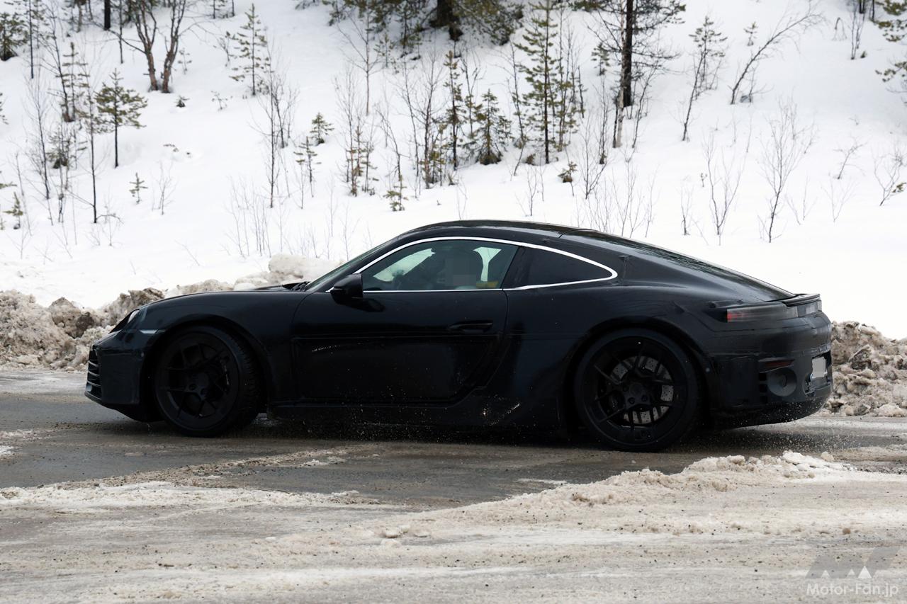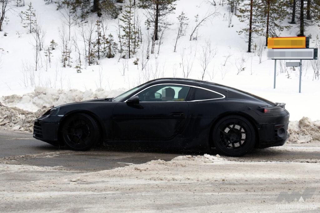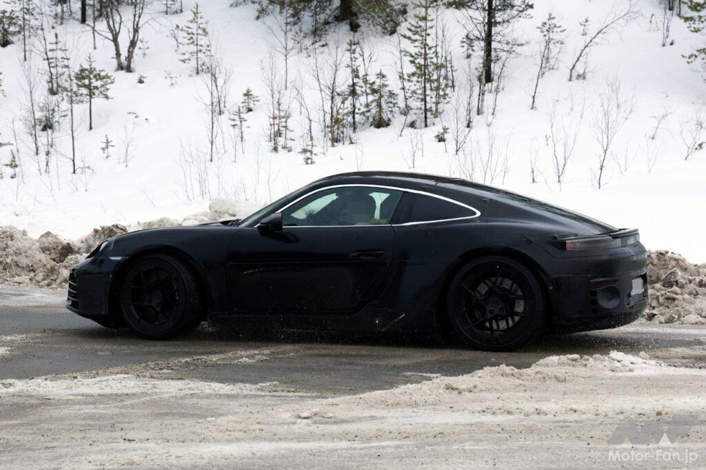 どちらのプロトタイプのフロントエンドにも、長方形のヘッドライトには丸いヘッドライトのデカールが貼られているが、もちろんダミーだ。また、バンパー両側のエアインテークに水平バーが装備されているが、これもダミーで、その奥には垂直のスラットが取り付けられており、新型911GTSハイブリッドに装着されたアクティブフラップと非常によく似ている。