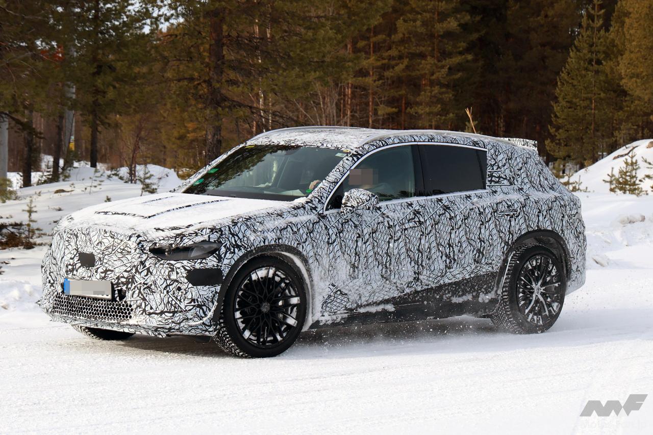 スカンジナビア山中で捉えたプロトタイプは、ボディ全体,が白と黒の迷彩で覆われているが、このAMG GLCと通常モデルの間にはいくつか顕著な違いがある。