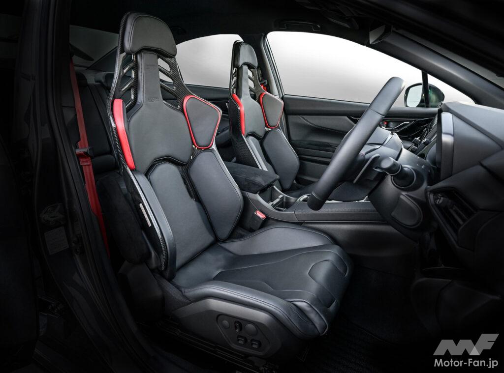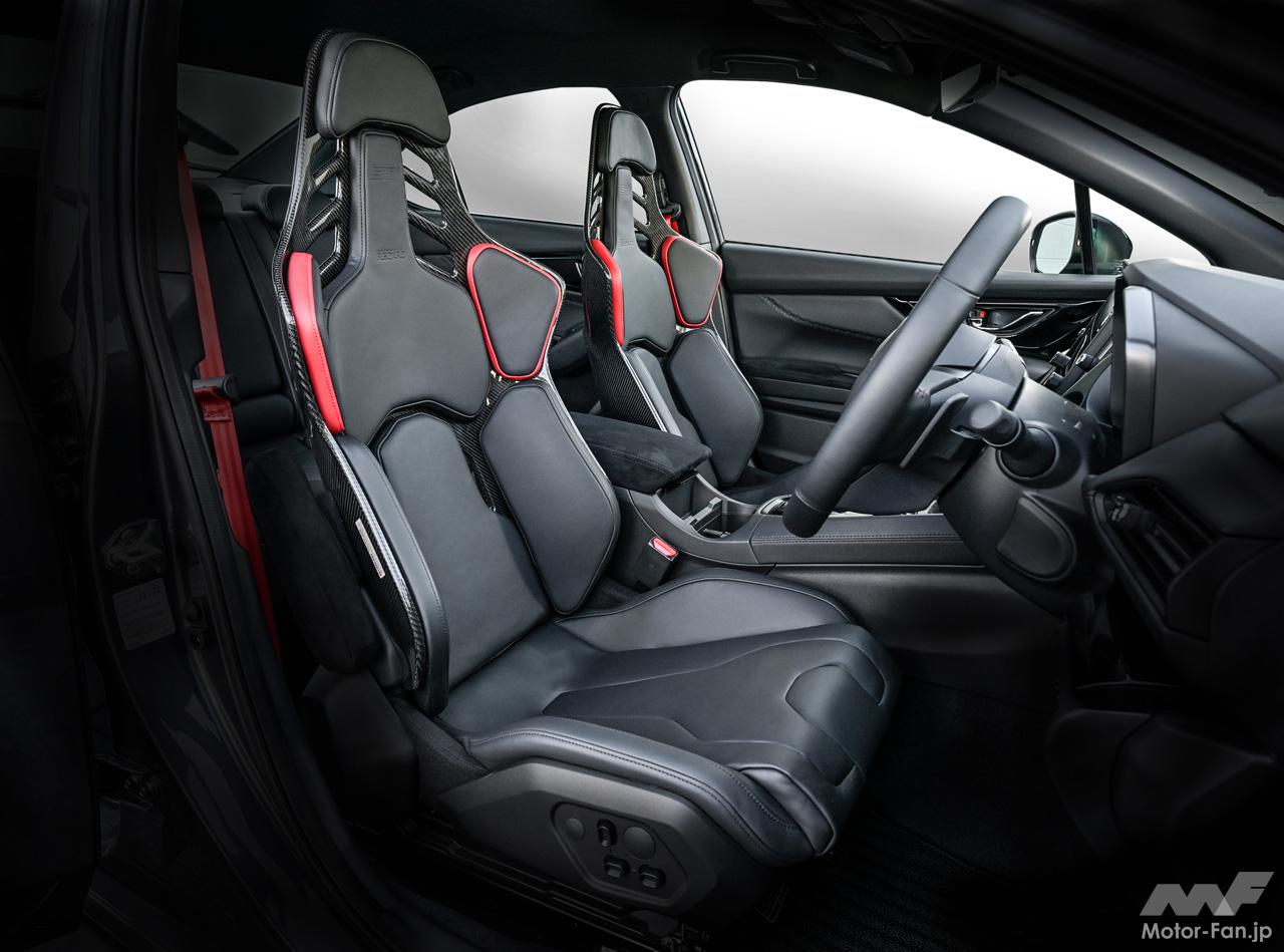 エクステリアは、空気の流れを整える新開発のスポーツサイドガーニッシュや、STIドライカーボンリヤスポイラーをはじめとするエアロパーツを装着し、高い高速安定性とハンドリング性能を発揮する。