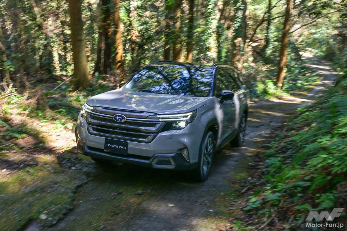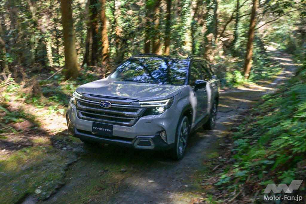 新型フォレスターには2.5Lハイブリッド(160PS/209Nm)と1.8Lターボ(177PS/300Nm)の2種類が用意され、2.5Lハイブリッドは低速域から最大トルクを発生する特性により、悪路でのトラクション性能が高く、未舗装路や雪道でも安心感のある走行が可能です。