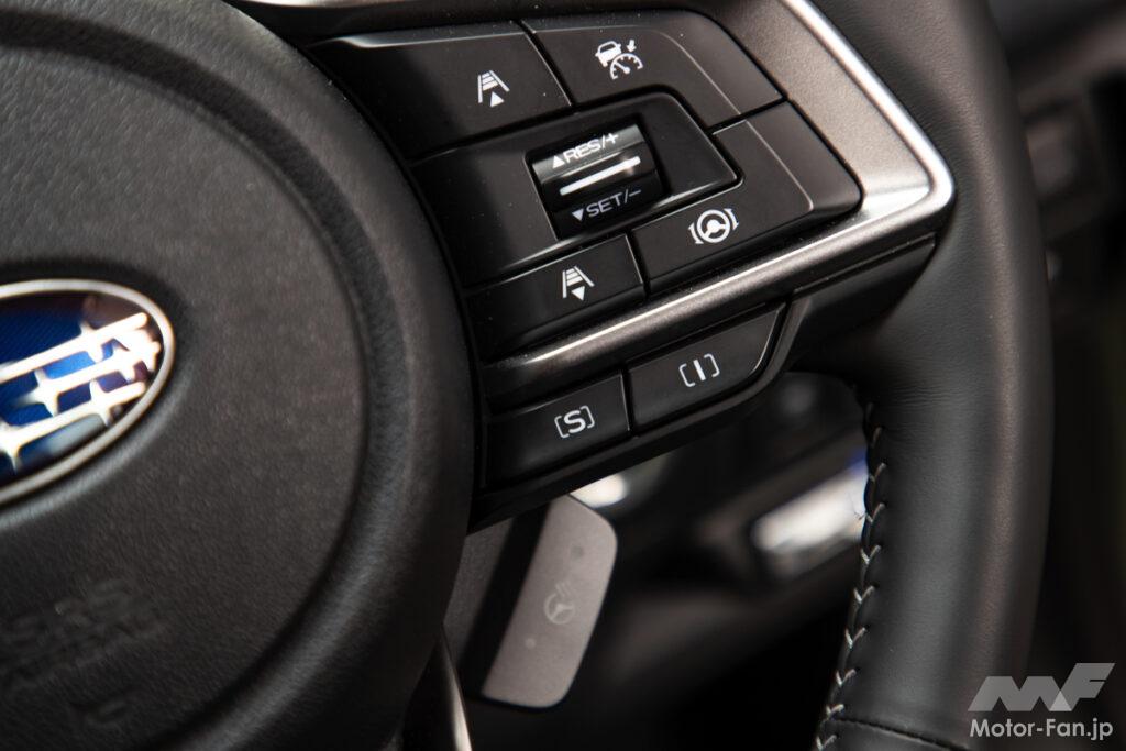 アイサイトはver.3からツーリングアシスト相当のものへグレードアップ。何よりサイドブレーキが手引きから電動パーキングブレーキへ変更されたことで、追従クルーズコントロール使用時に、待望の停止保持機能が追加されたことがトピックだ。