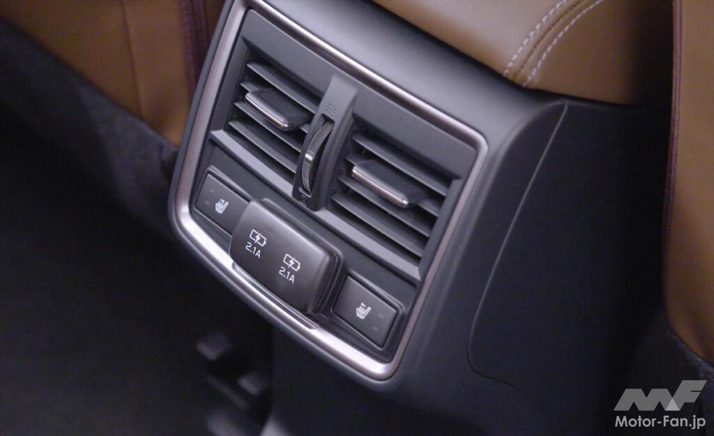 また、後席にもエアコン吹き出し口やシートヒーターを装備するほか、2.1AのUSBタイプAポートを2つ装備。後席のニースペース拡大と相まってすべての乗員が快適に過ごせるよう進化している。