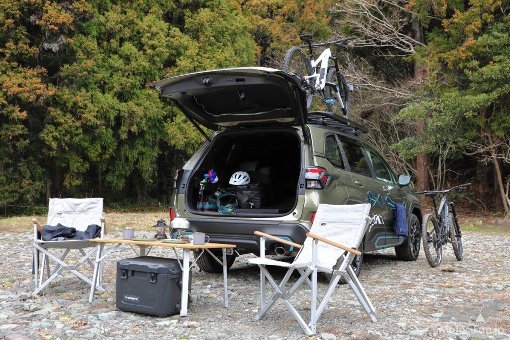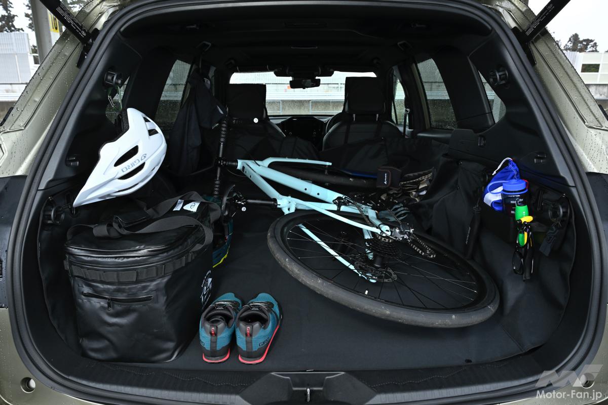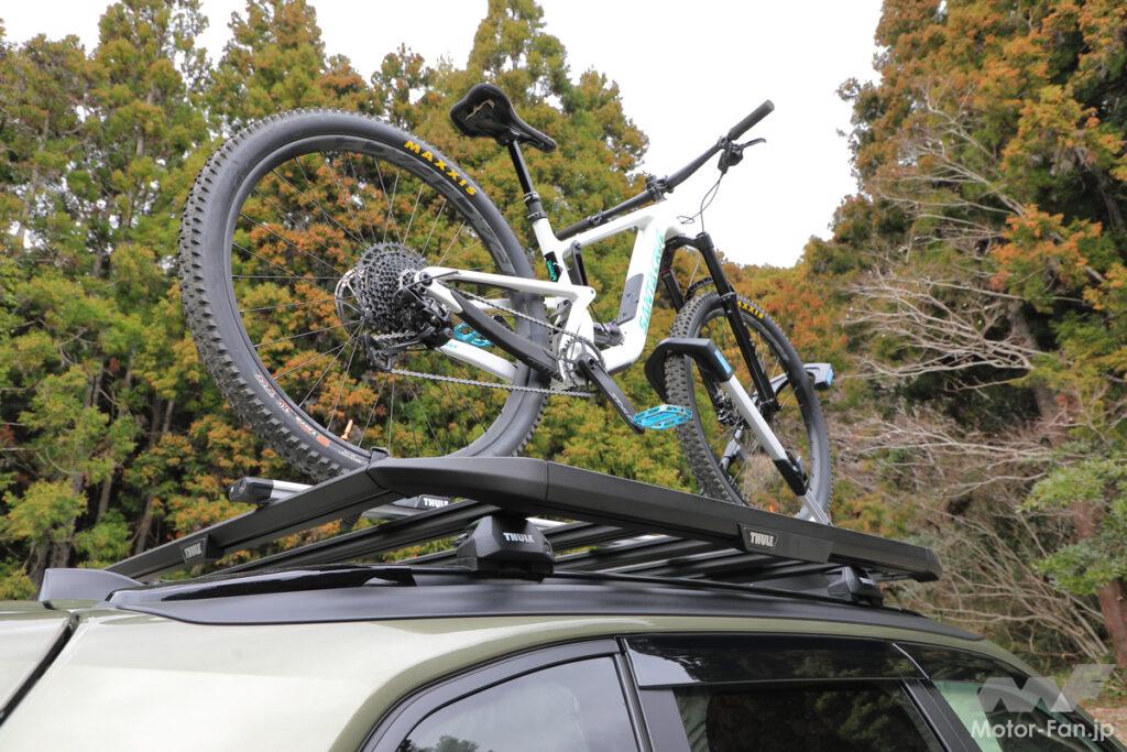 撮影車両はルーフに載せるパターンとラゲッジルームに載せるパターンが用意された。ラゲッジルーム積載に関しては、今回はそのまま載せているが、ラゲッジルーム内に設置するサイクルキャリアもある。フロントタイヤを外してクイックリリースで脱着できるタイプとスルーアクスルタイプを用意するなど痒いところに手が届くラインナップだ。
