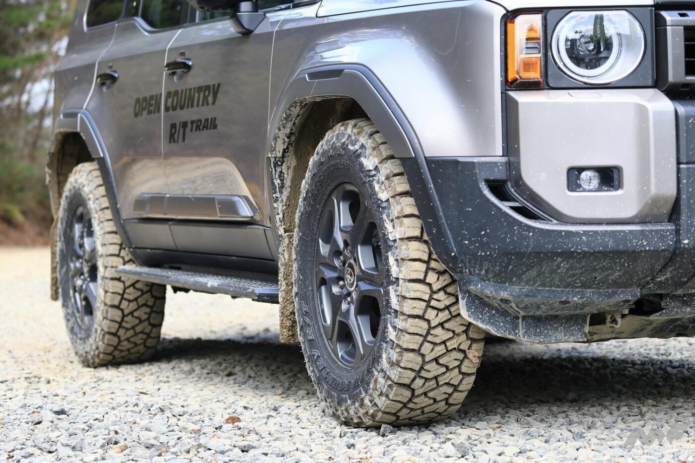 そこから「オープンカントリーR/Tトレイル」に乗り換えると驚いた。最初のひと転がり目にはエッジの効いたブロックが生み出すしっかり感はあるのだが、そこからは舗装路用タイヤのようなしっとり感になっていく。ロードノイズもオープンカントリーR/Tとは周波数帯が異なり、より耳に届かない感触なのも好印象だ。重量級かつプレミアムなクロカンSUVに求められる性能をバランスよく実現したタイヤといえる。