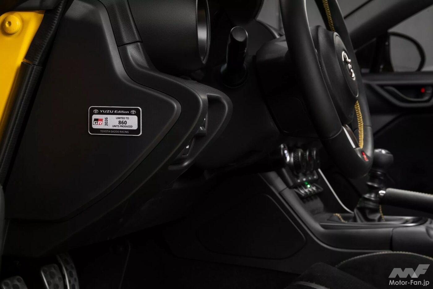 Yuzu Editionのボンネットの下には、標準のGR86と同じ2.4L自然吸気フラット4エンジンを搭載し、最高出力228ps、最大トルク249Nmを発揮する。トランスミッションの選択肢も変更されておらず、購入者は6速マニュアルまたはオートマチックを選択できるという。