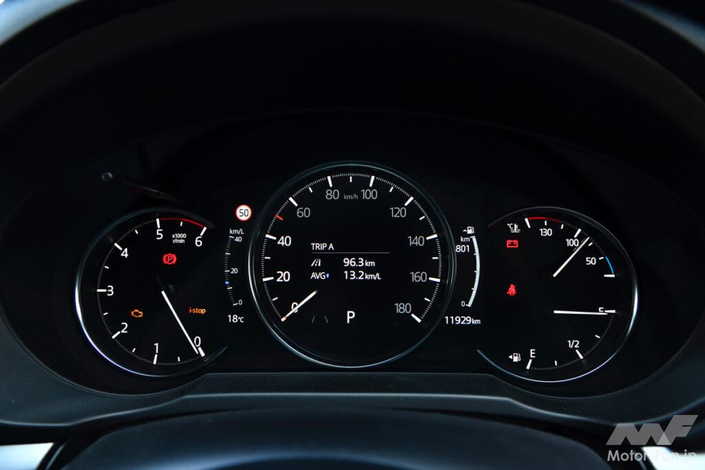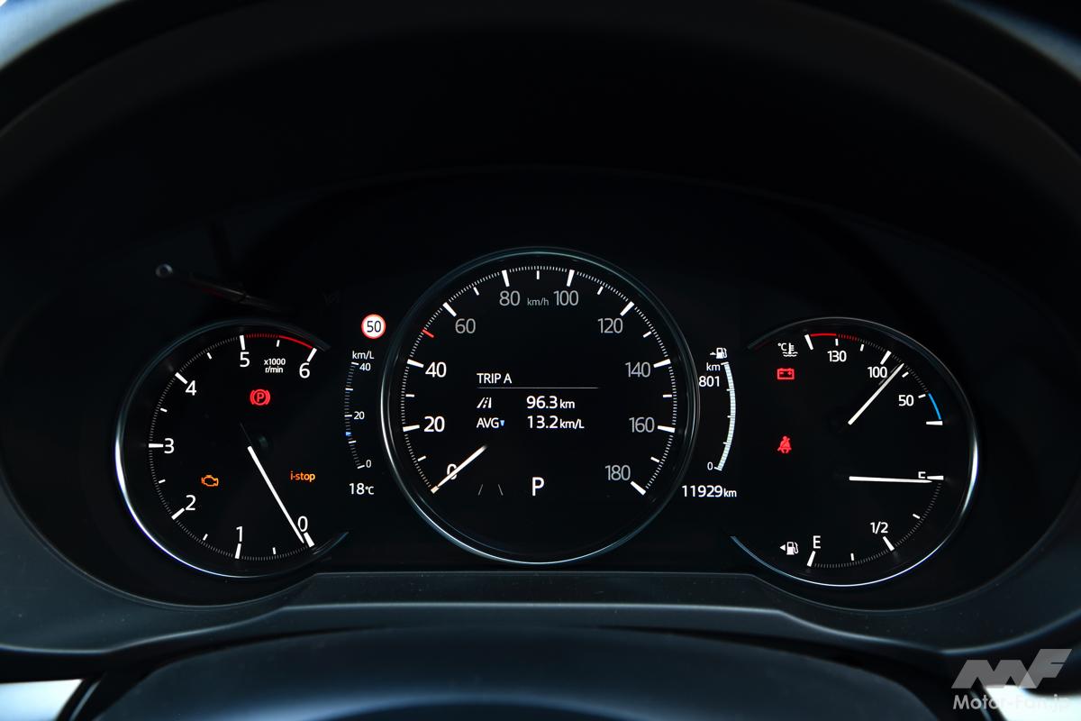 CX-5は3眼レイアウトで左から回転計、速度計、水温計と燃料計となっている。それぞれの間に燃費計や航続可能距離などを挟んでいるのは上手い配置と言えるだろう。