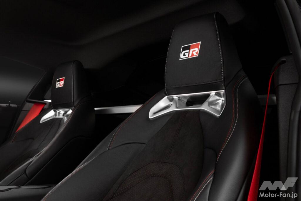車内では、本革仕立ての運転席シートにアルカンターラ素材を使用し、GRのロゴを刺繍で施しました。また、赤いステッチ、赤いシフトノブのハイライト、赤いシートベルトがスポーティーな内装を際立たせている。