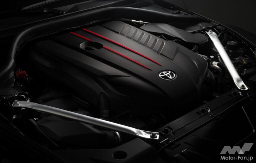 GRスープラの3.0L直列6気筒ターボエンジンは、幅広い回転域で強力なトルクを発揮し、爽快なパフォーマンスを実現する。8速AT車は最高出力382ps・最大トルク498Nmを発揮し、0-96km/h加速3.9秒、MT車は4.2秒を記録する。AT車はメーカー推定値で市街地9.3km/L、高速道路12.3km/L、複合10.6km/Lの燃費性能を実現している。これは、車両が停止している間はエンジンを停止させる標準装備のスタート/ストップ技術による効果もある。
