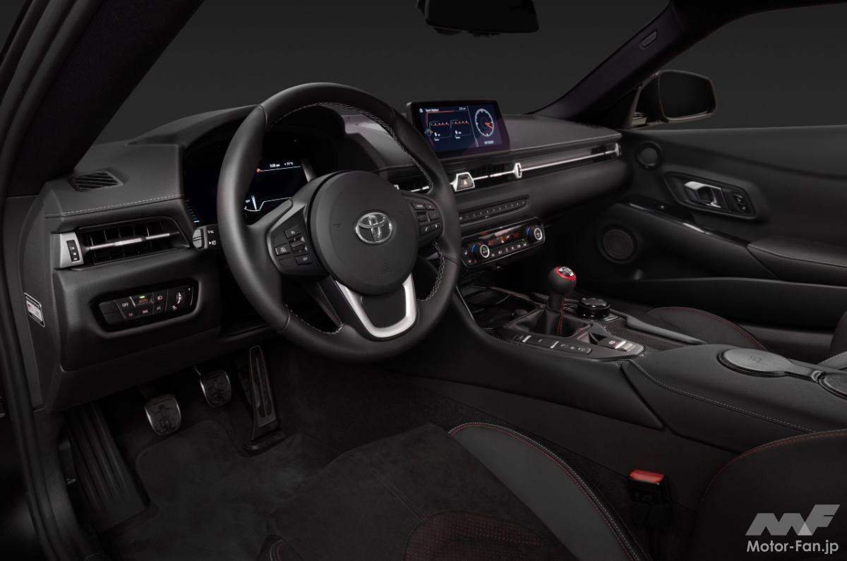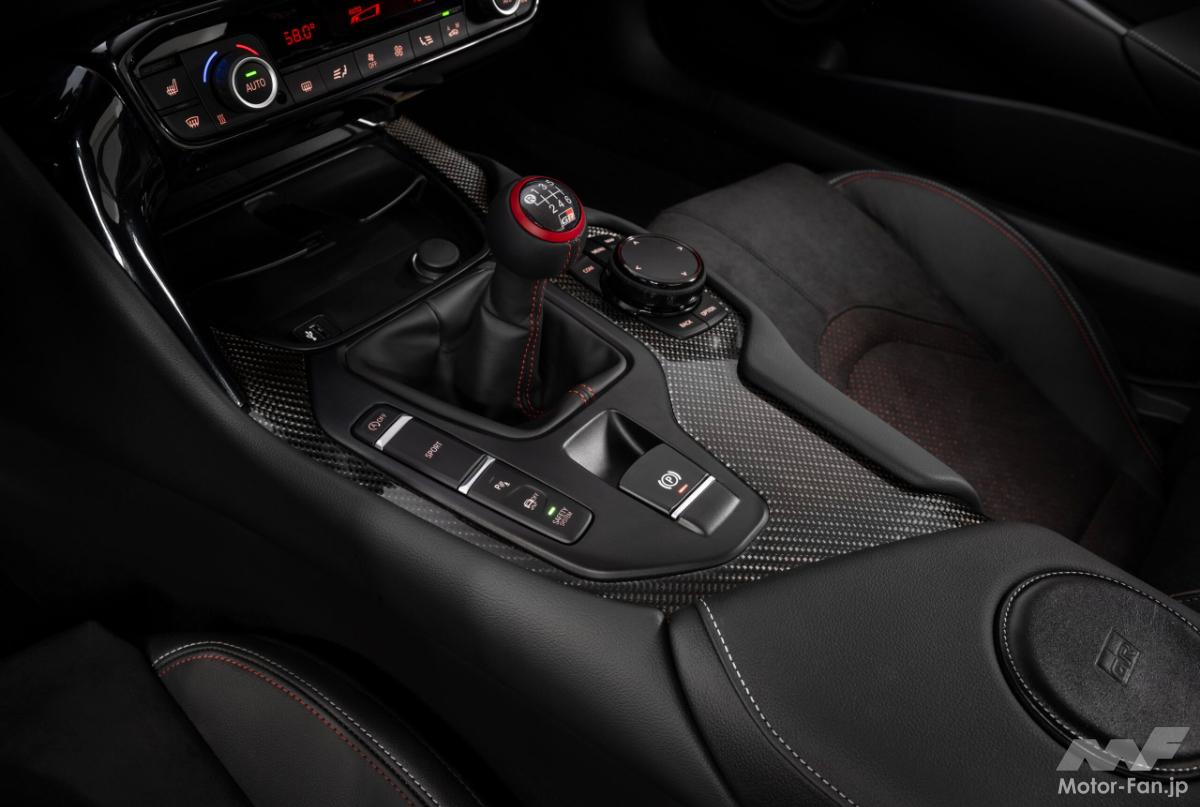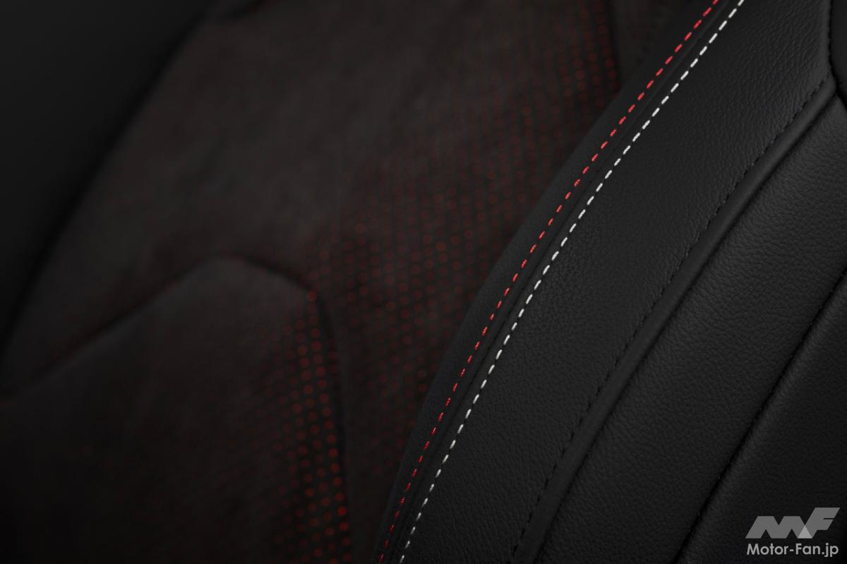 車内では、本革仕立ての運転席シートにアルカンターラ素材を使用し、GRのロゴを刺繍で施しました。また、赤いステッチ、赤いシフトノブのハイライト、赤いシートベルトがスポーティーな内装を際立たせている。