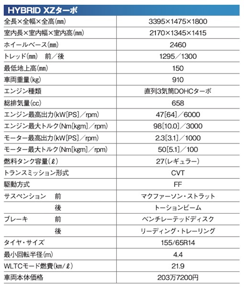 ギアのラインナップは上級の「XZ」のみでNAとターボモデルの2タイプ。それぞれにFFと4WDが揃う。クロスオーバー軽と言っても最低地上高はスペーシアと同じ150㎜だ。スズキのクルマは軽量化に熱心だが、FFで900〜910㎏、ターボ4WDでも960㎏と軽い。
