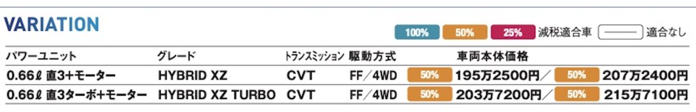 ギアのラインナップは上級の「XZ」のみでNAとターボモデルの2タイプ。それぞれにFFと4WDが揃う。クロスオーバー軽と言っても最低地上高はスペーシアと同じ150㎜だ。スズキのクルマは軽量化に熱心だが、FFで900〜910㎏、ターボ4WDでも960㎏と軽い。