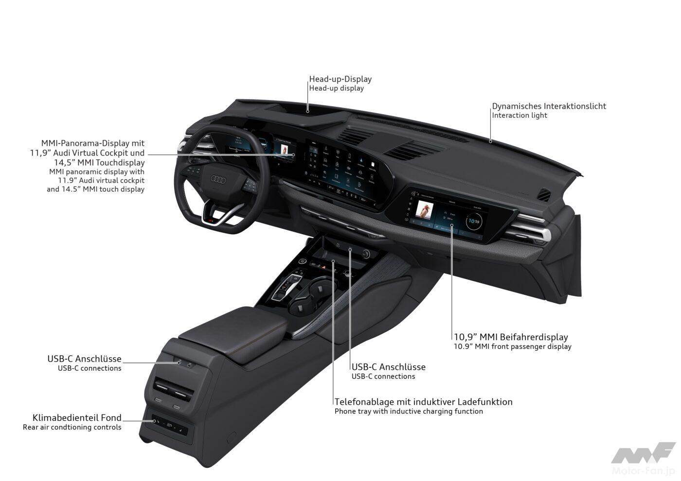 インテリアでは、カーブしたディスプレイに搭載されたインフォテインメントシステムが目を惹く。ドライバーの目の前にあるメーターは11.9インチのAudiバーチャルコックピットプラス、センターには14.5インチのMMIタッチディスプレイが埋め込まれている。さらに、助手席の乗員専用の10.9インチMMIパッセンジャーディスプレイを設定。S5系に標準、A5系にオプション設定する。情報表示系では、ヘッドアップディスプレイの表示面積が拡大し、情報量が増えているのも新型の特徴である。