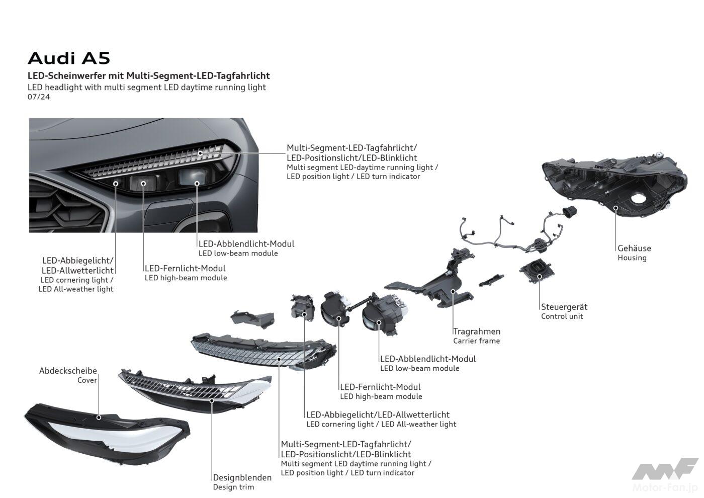 近年のアウディはライティング技術に凝っており、新型A5もその流れを受け継いでいる。LEDを用いたデジタルデイタイムランニングライト(DRL)は全車に標準装備。このDRLはダイナミックインジケーター付きのLEDヘッドライトと連動して8パターンの点灯パターンから選択可能。リヤコンビネーションライトもダイナミックターンインジケーター付きのLEDだ。S5系は第2世代のOLEDリヤライトを標準で装備(A5系はオプション)し、より精細なライトシグニチャーを表現する。