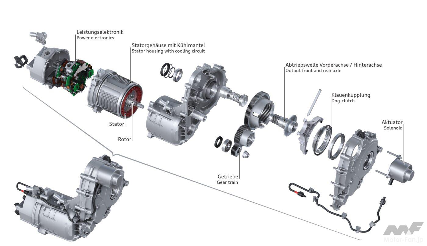 MHEV plusはパワートレーンジェネレーター(PTG)と呼ぶモータージェネレーターユニットを、縦置きに配置するトランスミッションの後端に付加した格好。ギヤトレーンでトランスミッションの出力軸とつながっており、ドッグクラッチで完全に動力伝達系から切り離すことができる。減速時に最大25kWで回生したエネルギーは、ラゲッジルーム下に搭載するリチウムイオン電池(三元系ではなくリン酸鉄リチウム=LFPを採用)に蓄える。