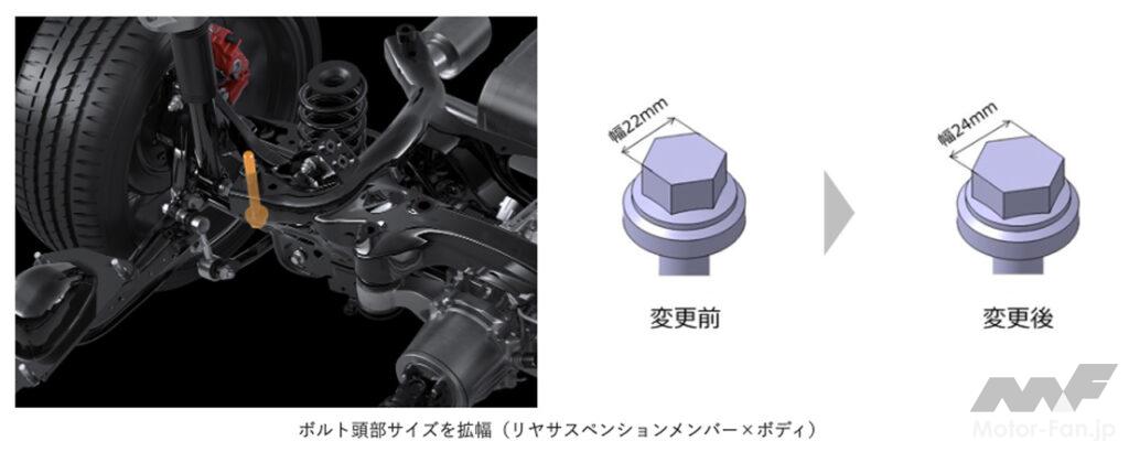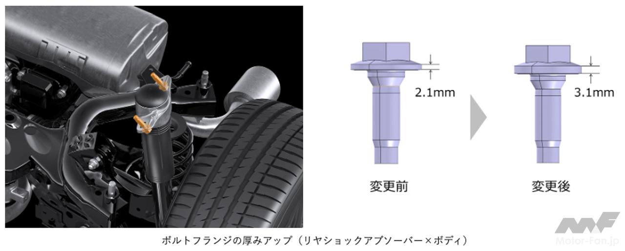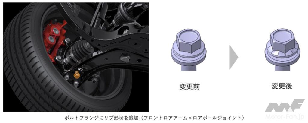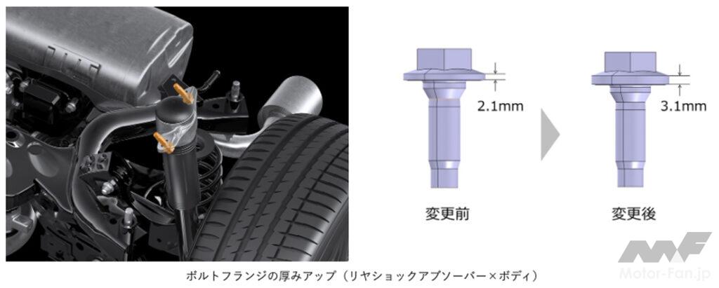 「クルマとの一体感の進化」として、シャシー部品の締結ボルトの一部に締結剛性の高い特別なボルトを採用。ステアリング操作に対する応答性と直進安定性を向上させた。