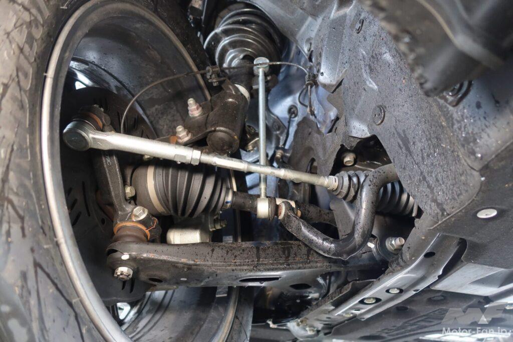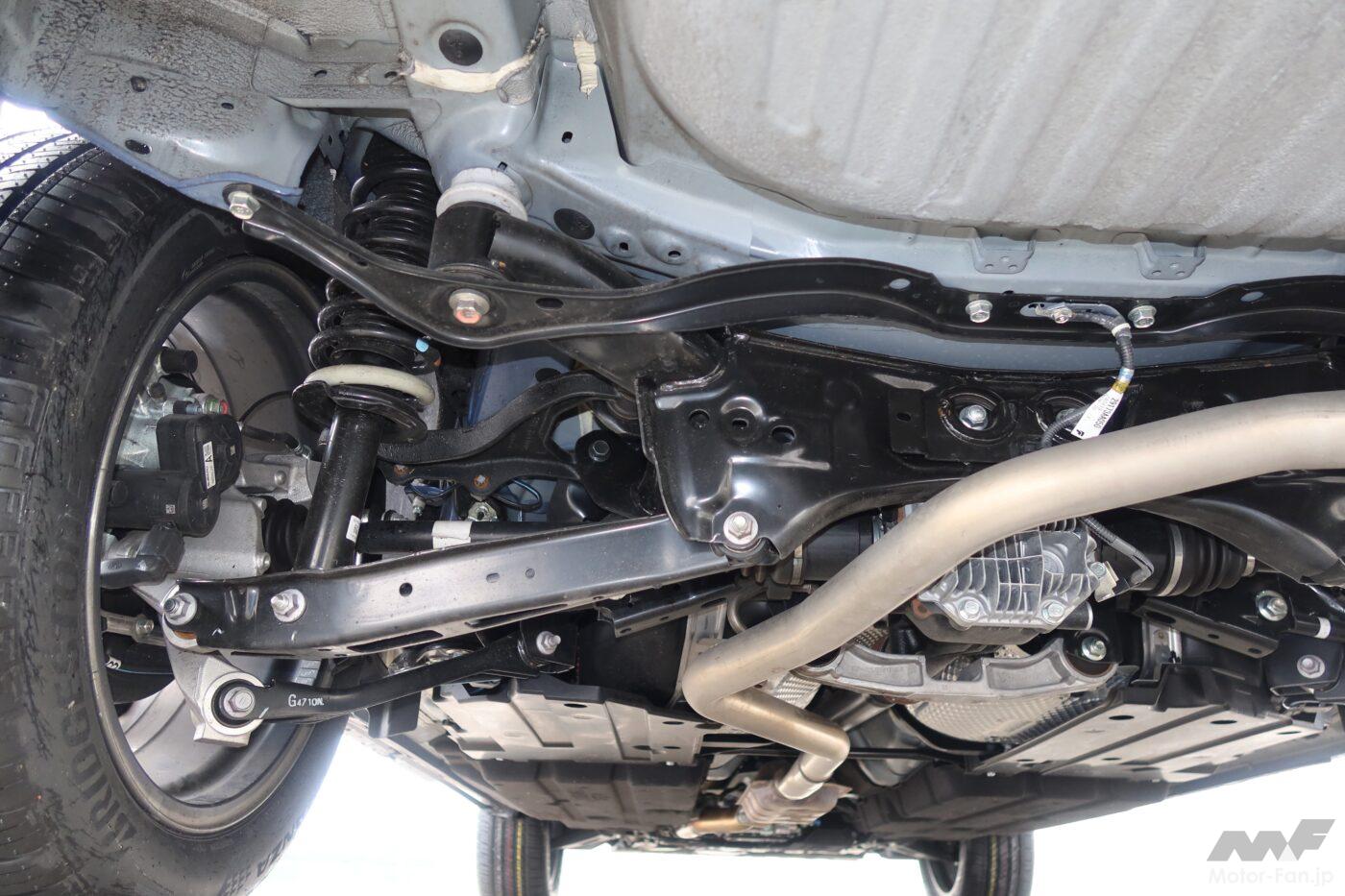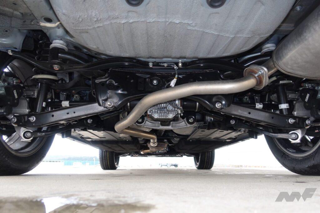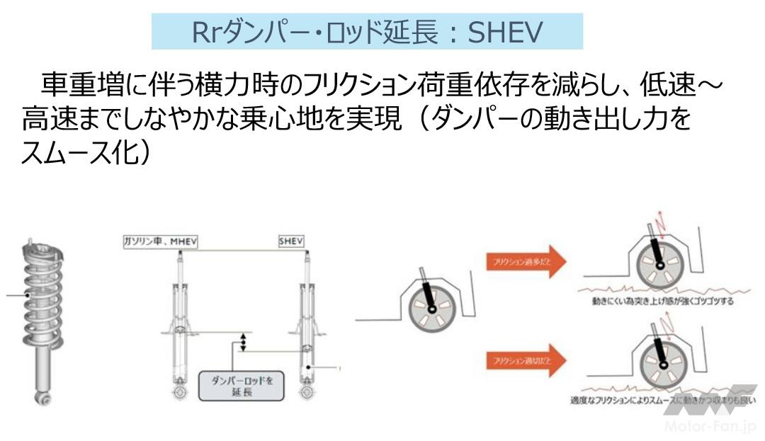 ストロングハイブリッド車はリヤダンパーのロッドを長くした。同じことはクロストレックのストロングハイブリッド車でも行なっており、重量増への対応だ。車重が増えると旋回時の横力が大きくなる。横力を受けるとロッドが摺動部に強く押し当てられてしまい、摩擦で動きが渋くなる。渋くなるとしなやかさが欠けてしまう。ロッドを長くすると摺動部にかかる力が弱まるので、動きがしなやかになるというわけだ。