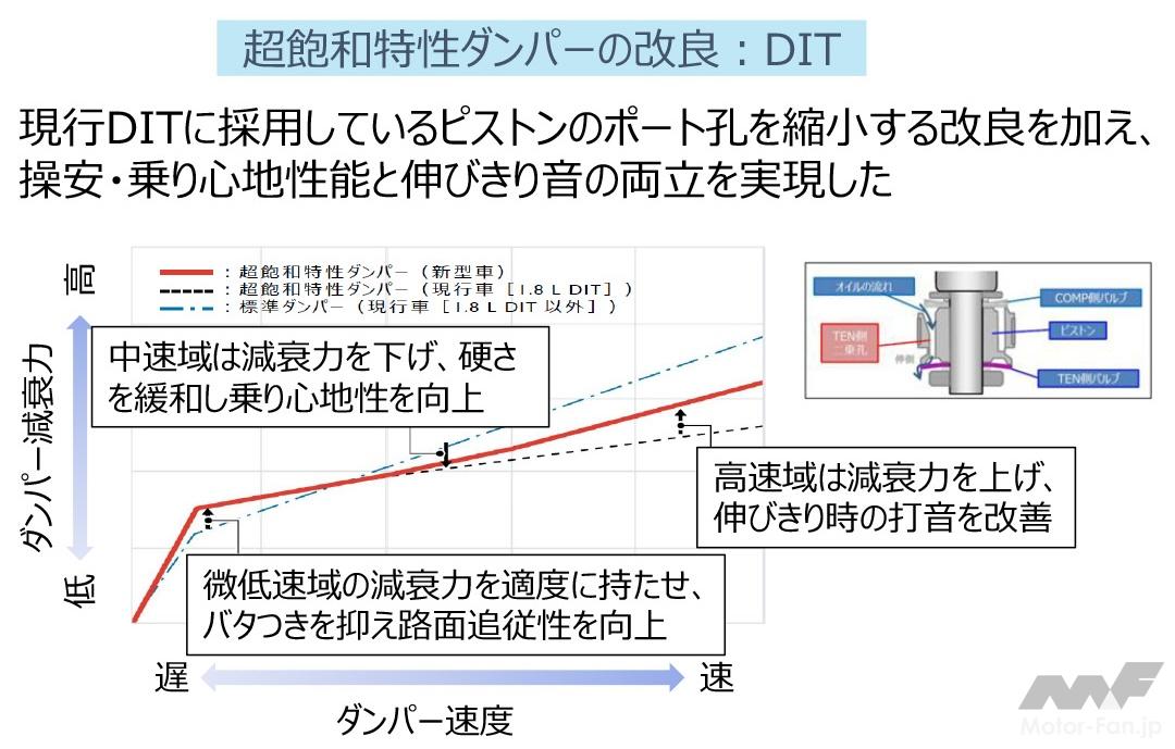ターボ車のほうもダンパーの仕様を変えた。こちらはバルブの機構を変更。微低速域では減衰力を適度に持たせてバタつきを抑え、路面追従性を向上させる方向。中速域では減衰力を下げ、硬さを緩和して乗り心地を向上させた。また、高速域では減衰力を上げ、伸びきり時の打音を改善している。フォレスターのダンパーは歴代、旧ショーワに起源を持つアステモ(Astemo、4月1日に日立Astemoから社名変更)製だそう。