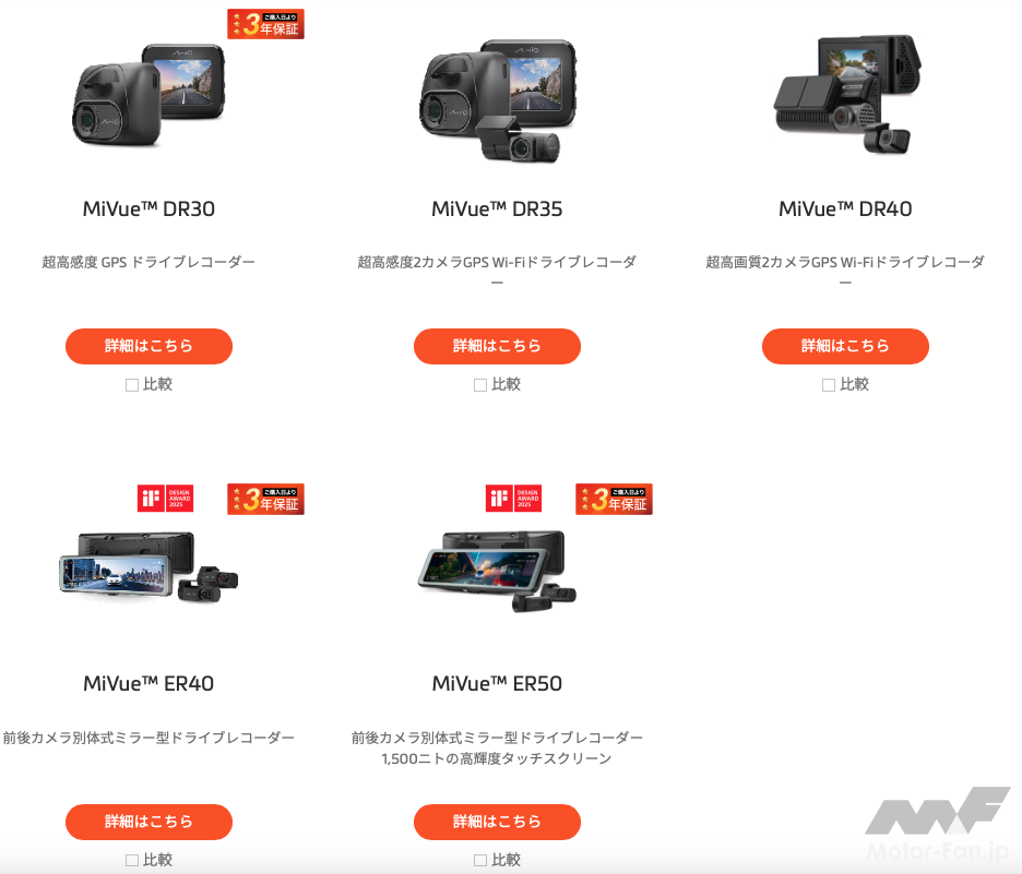 Mioが現在ラインナップしているデジタルミラー一体型以外の製品は1カメラ型1モデル(DR30)、2カメラ型2モデル(DR35、DR40)となっている。いずれもフルHD以上のカメラに「STARVIS」CMOSセンサーを採用。GPSはもちろん、2カメラモデルはWi-Fiも備えた高性能モデルとなっている。