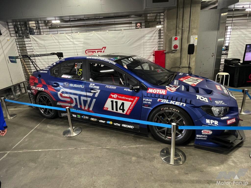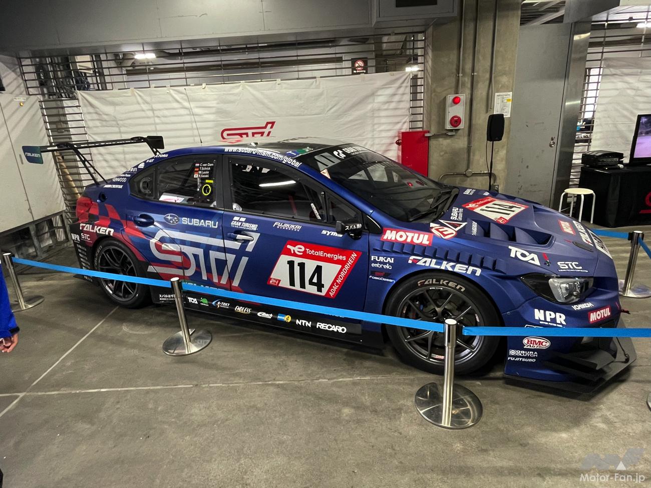 スバルブースに入ってすぐに展示してあるのが、2022年のニュルブルクリンク24時間耐久レースの参戦車両「WRX STI NBR Challenge 2022」だ。