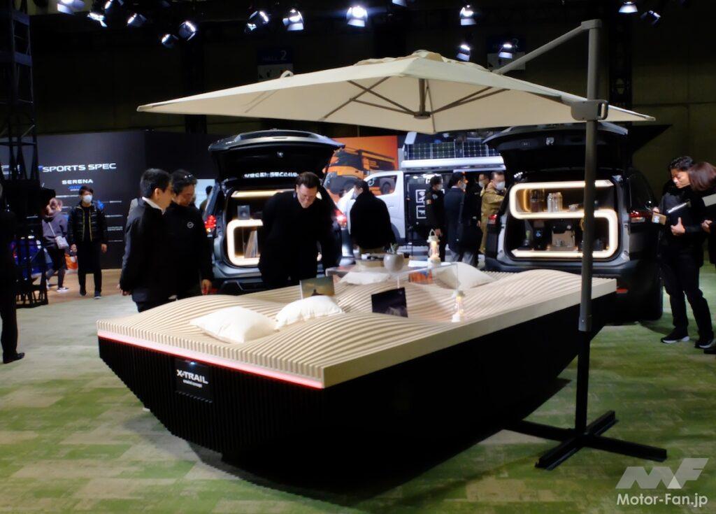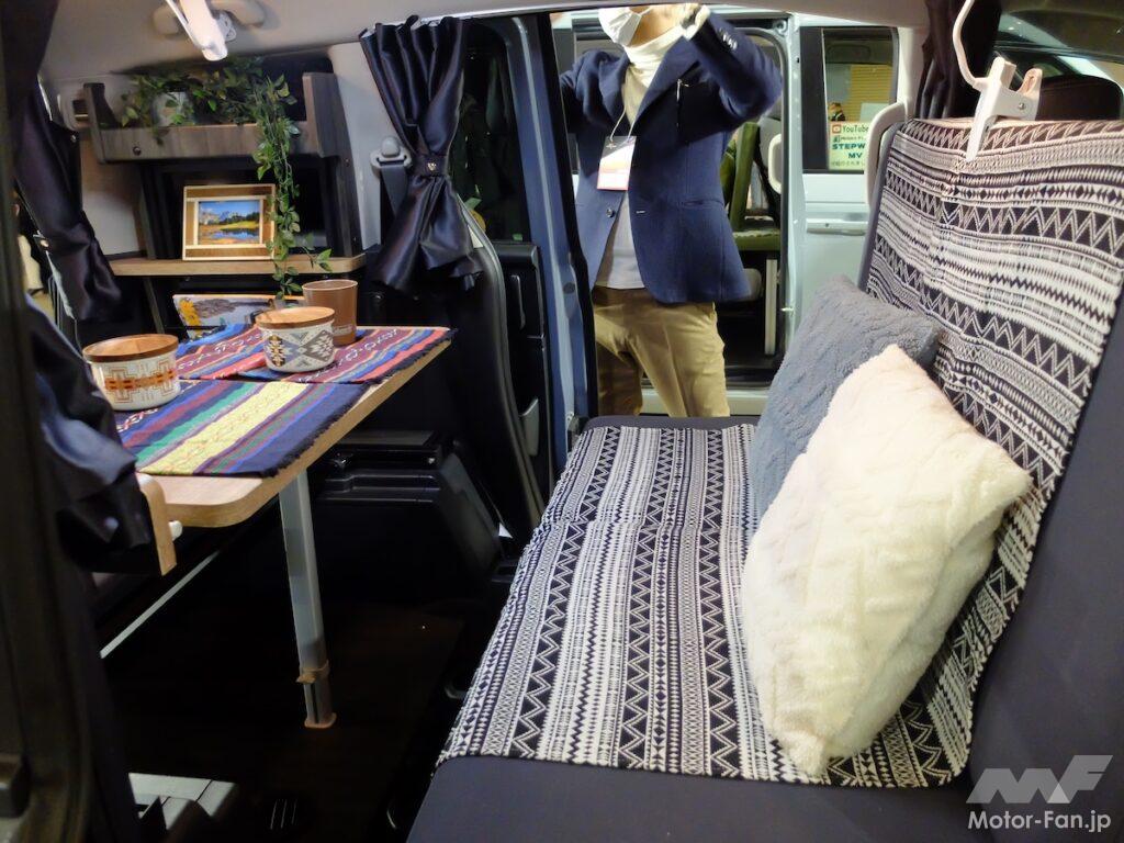 低い荷室、フラットになる後席を利用したキャンパー仕様。シート&シートバックに使える寝台とテーブルを用いることで、写真のようにダイニングスペースも実現。ベッドにすれば、大人2人がゆったり寝られるサイズを実現。
