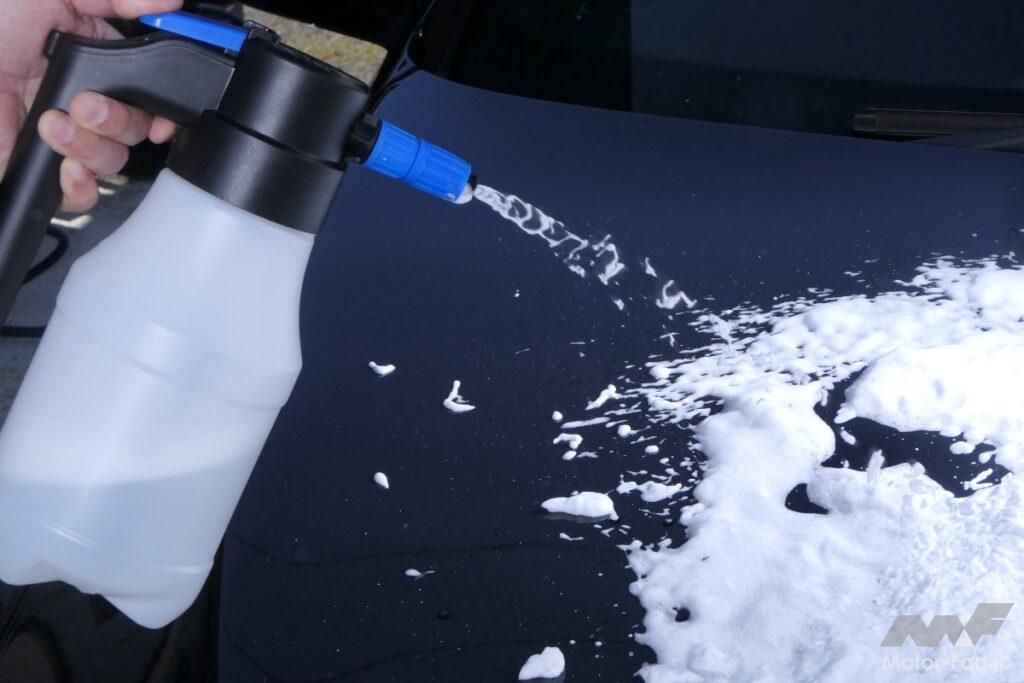 一般的に手洗い洗車では中性洗剤を使うことが多い。しかし、ボディの埃や汚れは落せても、ウロコ汚れや半透明のミネラル汚れ、油分や黒スジなどが残りやすいのは否めない。そのためパッと見はキレイでも光沢感がイマイチだったり、光に当たるとシミや汚れが目立つ……といったケースもありがちだったのだ。