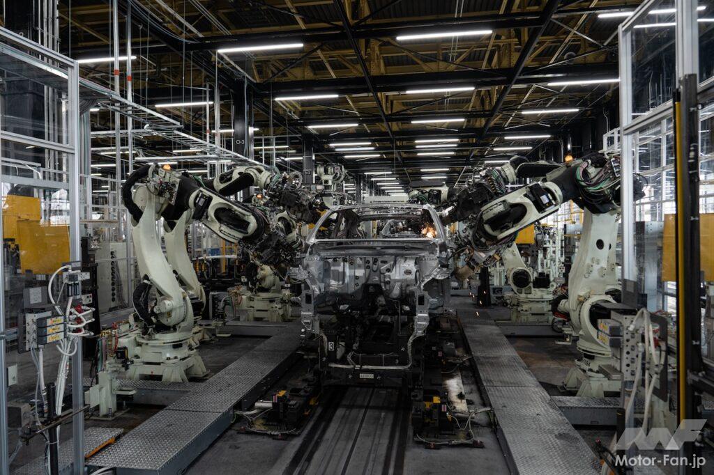 GRファクトリーでのボディ工程では、レーシングカー製作と変わらぬ手間を量産段階に持ち込んでいる。アンダーフロア溶接工程では、エンジン搭載部であるエンジンコンパートメント、座席が配置されるフロントフロア、さらにリヤフロアという3つのパネルを一枚に溶接している。溶接ロボットの脇には複数の溶接ガンが格納されており、これを交換することで一台のロボットが複数の部位の溶接を担う。