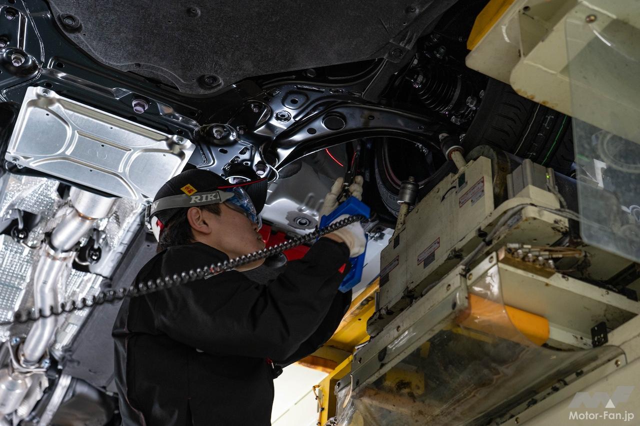また、一般的に市販車からレーシングカーを製作する際には、ボディ補強のために内外装を剥がして追加溶接を施し、エンジン内部(ピストン、コンロッド等)を分解・組み直すといった大掛かりな作業が必要となる。さらにブレーキやサスペンションも複数セットからバランスの取れたものを選別して装着する。このような手間と工程を、GRファクトリーでは生産段階から組み込んでおり、レーシングカー並みの高剛性ボディと高精度の足周りを備えた車両を作り上げているのだ。