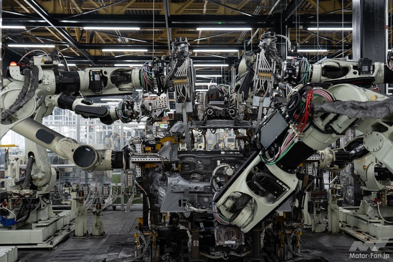 GRファクトリーでのボディ工程では、レーシングカー製作と変わらぬ手間を量産段階に持ち込んでいる。アンダーフロア溶接工程では、エンジン搭載部であるエンジンコンパートメント、座席が配置されるフロントフロア、さらにリヤフロアという3つのパネルを一枚に溶接している。溶接ロボットの脇には複数の溶接ガンが格納されており、これを交換することで一台のロボットが複数の部位の溶接を担う。