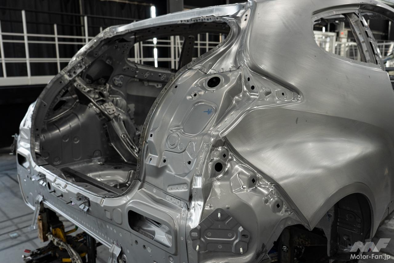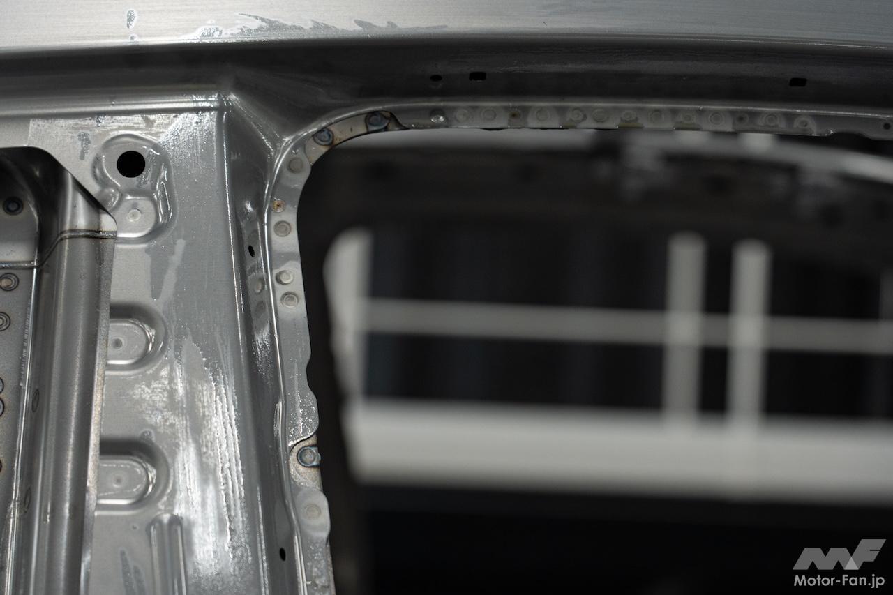 スポット溶接の打点数はノーマルヤリスの3700点に対してGRヤリスは約4500点、カローラスポーツの5300点に対しGRカローラは約5700点に達する。モータースポーツ車両開発で得た知見をもとに、結合強化が必要と判断された部位には打点数を増加させ、特にドア上部などでは集中的な補強がなされている。また、GRヤリスのボディには約35mと、通常モデルよりも約15m長く構造用接着剤が使用されているのも特徴だ。