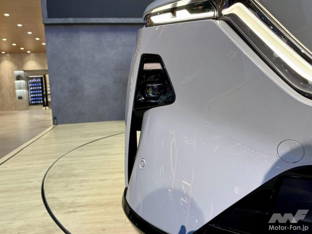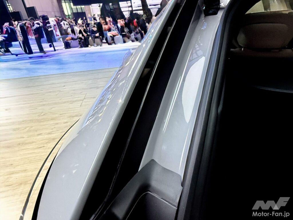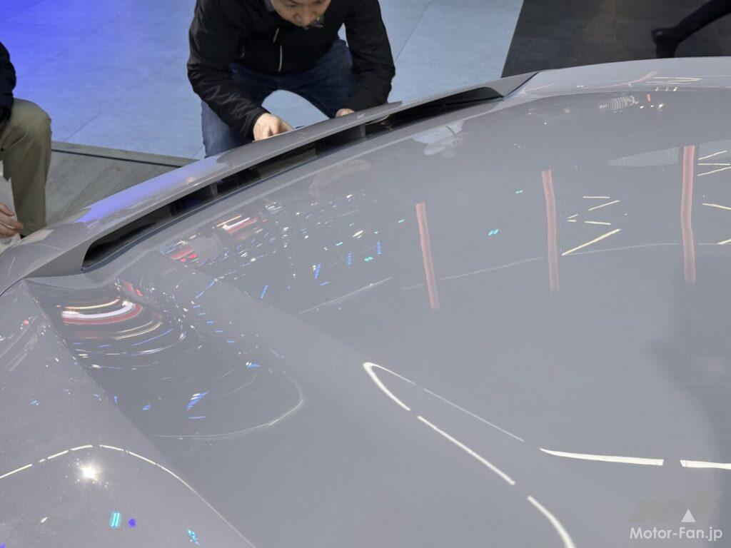 エクステリアデザインでは、SUVではじめて「9風道デザイン」を採用したこと。この風道とは、どうやら空力処理のことでフロントはCピラーに空気の通り道を作っていることを指している。この空力向上で「41km航続距離が向上」したという。また、高速走行時には705Nのダウンフォースが得られるという。