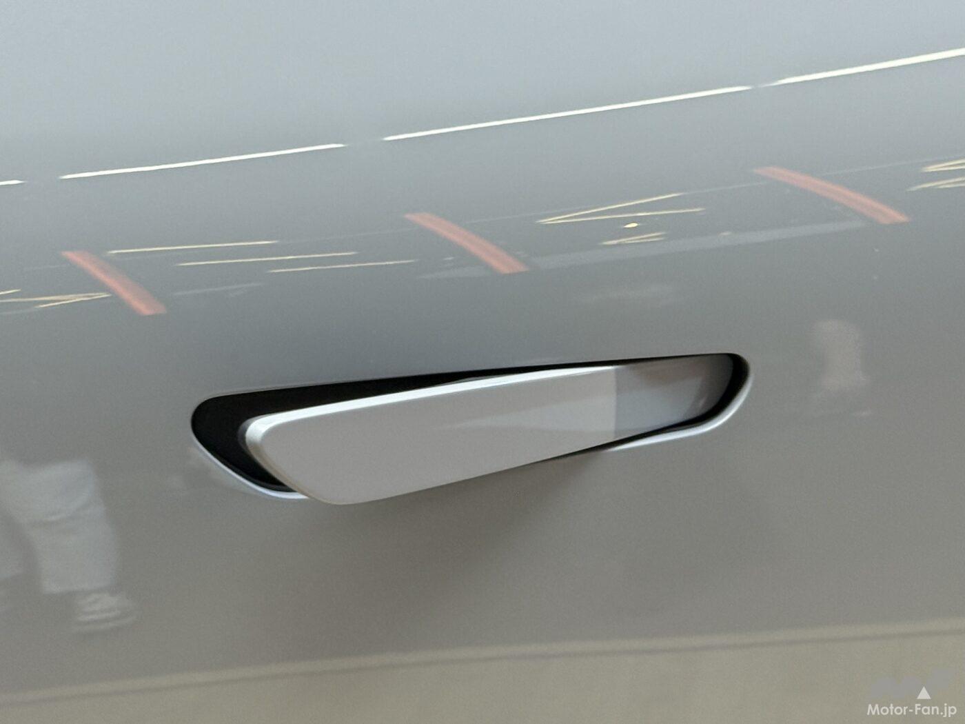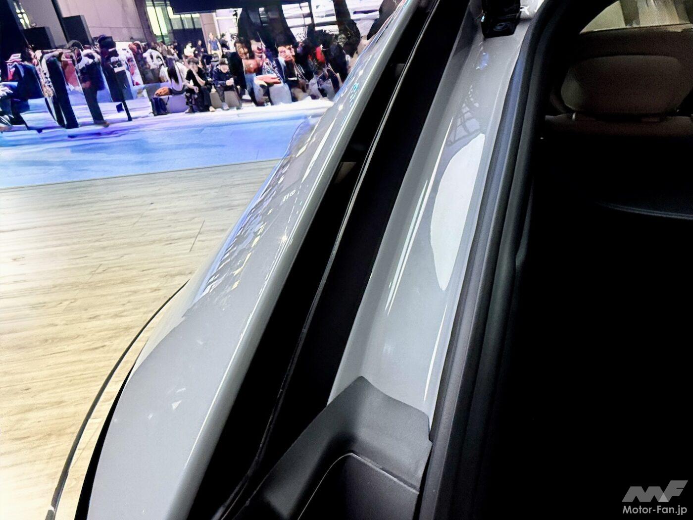 エクステリアデザインでは、SUVではじめて「9風道デザイン」を採用したこと。この風道とは、どうやら空力処理のことでフロントはCピラーに空気の通り道を作っていることを指している。この空力向上で「41km航続距離が向上」したという。また、高速走行時には705Nのダウンフォースが得られるという。