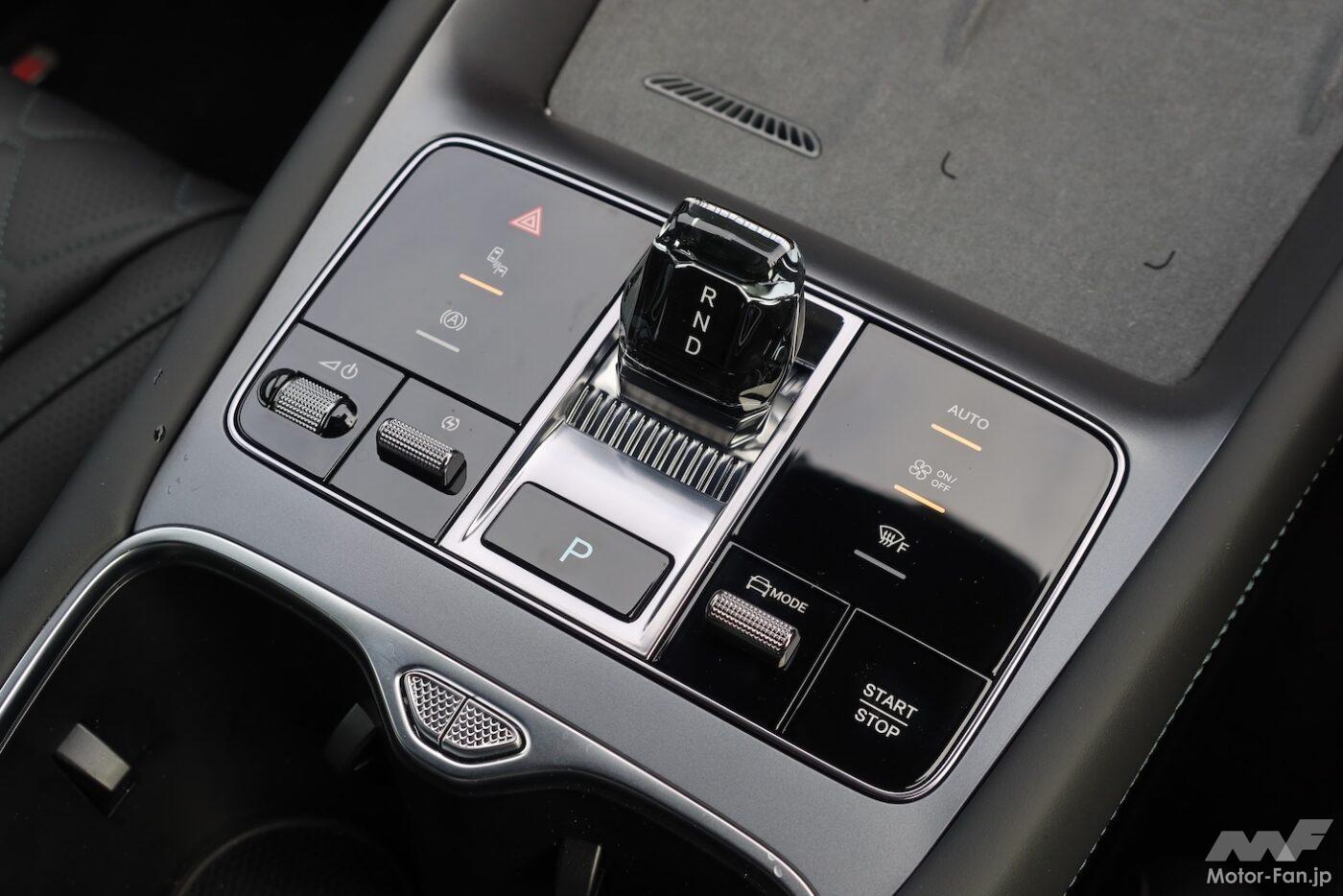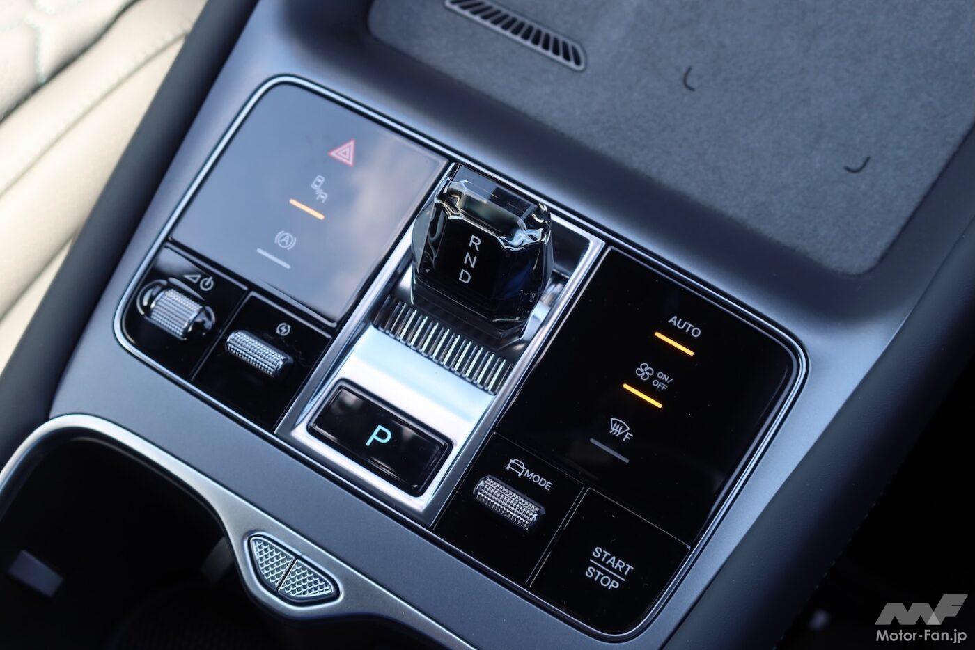 前席はシートベンチレーションが付いているし、シートヒーターは前後4席に付いており、足元が広く、左右を隔てる段差がなくてフラットなフロアを持つ後席は20度のリクライニングが可能。センターコンソールには50Wの出力を持つワイヤレス充電機能が付いており、ご丁寧に冷却ファンが装備されている。