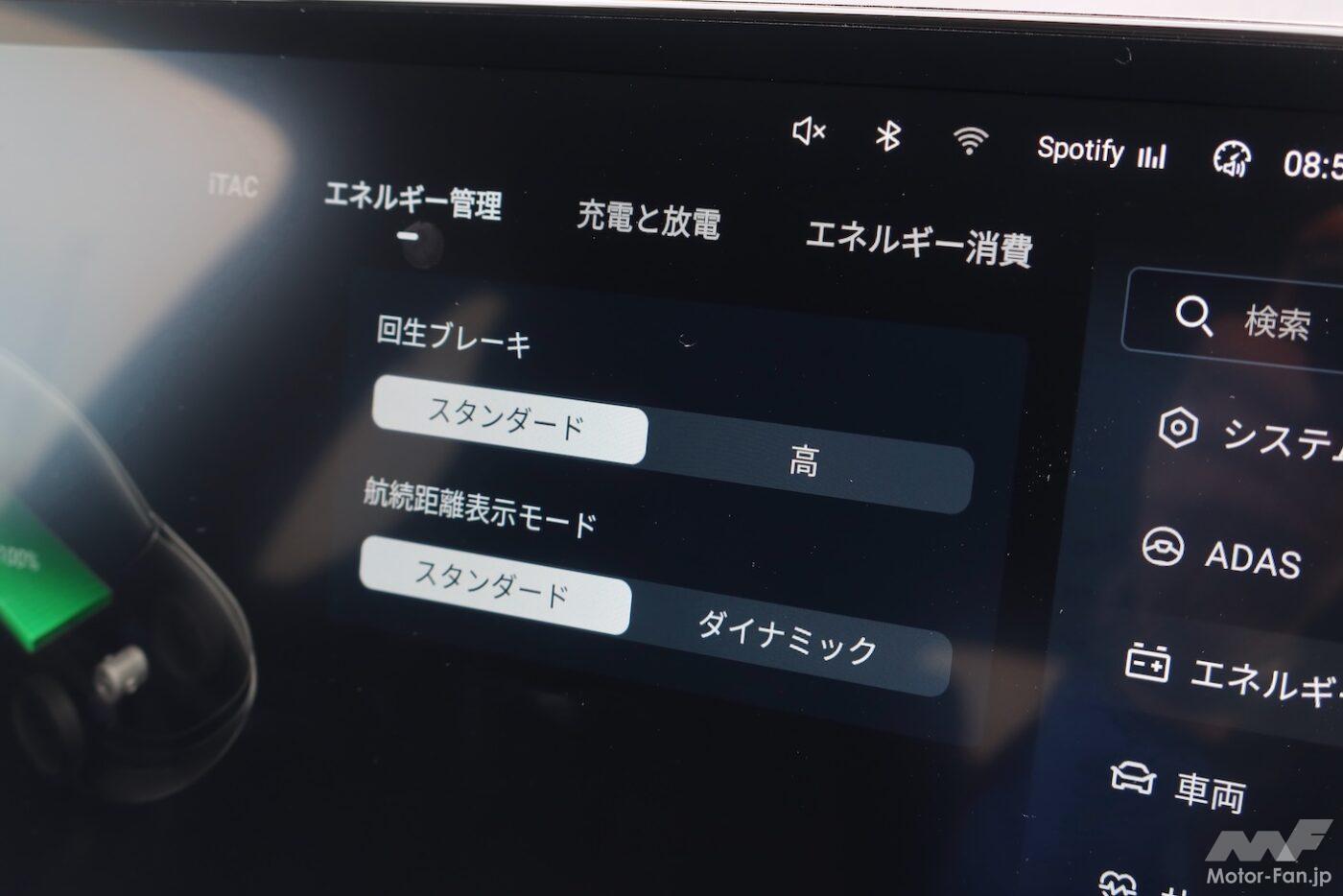 回生ブレーキの強弱(「スタンダード」と「高」の2段階)はタッチディスプレイでも切り換え可能だが、シフトセレクターの近くにあるスイッチでも切り替えが可能。「高」に切り換えても強くならず不思議に思って確認したところ、SOCが93%以上のときは回生ブレーキが働かないようになっているとのことだ。